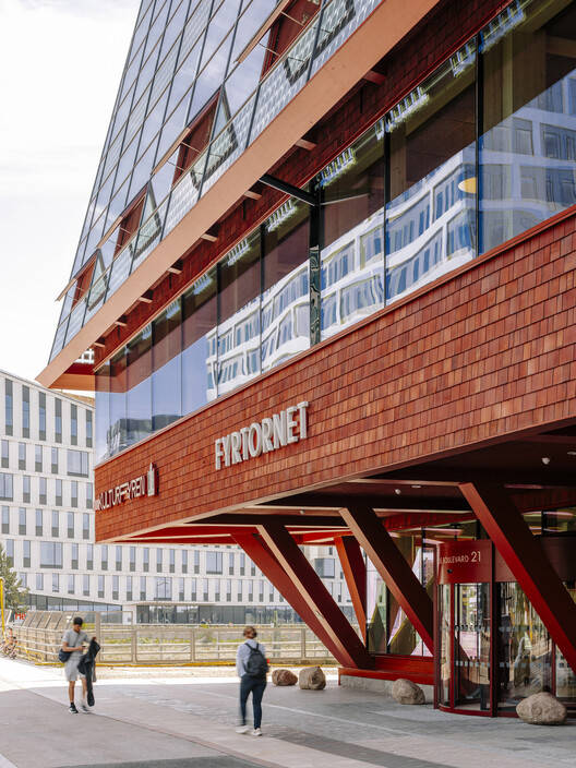 Fyrorternet不仅仅是一个建筑,它还是共享区大使馆的一个聚会场所和关键要素。公共门厅与商业空间和地区图书馆无缝融合,鼓励不同群体之间的相遇,丰富城市生活。凹进的入口和悬挑的屋顶创造了一个有遮蔽的城市空间,吸引人们聚集。两个立面采用红雪松木瓦装饰,而另外两个则采用双层玻璃幕墙,反映出远处的城市。
