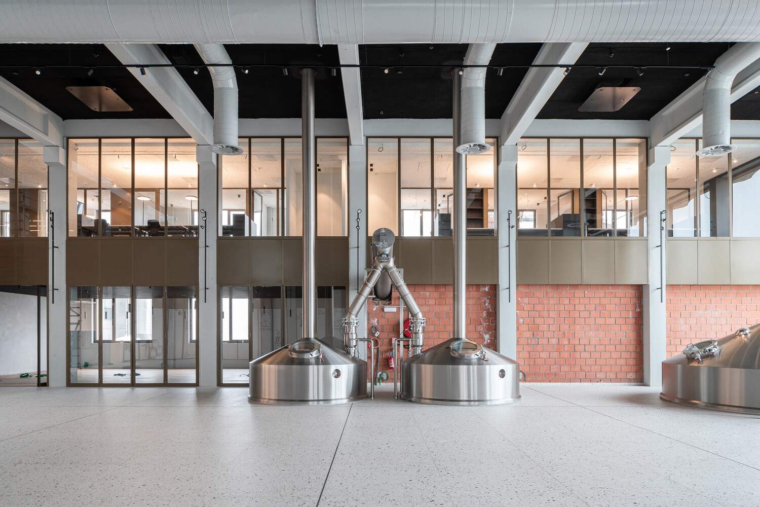 A third component of the design is the wall surrounding the silo and tank area, which through material use and architectural form is integrated seamlessly into the language of the brewing hall. This wall continues the rhythm of the concave segmented façade with the same nuanced red/brown brick and resting on a concrete base. The most visible tanks behind this low wall are also embraced as part of the façade. They are finished in high-quality stainless steel to enhance their visual impact and express the building's industrial function. Inside the building, the design language of cylindrical forms is carried through in the volume of the elevator shaft, the monumental spiral staircase, and the large entrance lobby.