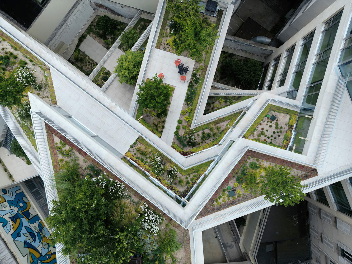 工作空间和人类体验——该设计优先考虑促进互动、可见性和幸福感的工作空间。正式和非正式会议区域的平衡增强了沟通与协作。内部的空间质量经过仔细校准,确保最佳的日光渗透、热稳定性和声学舒适性。高品质材料和精心制作的细节的使用增强了持久性和精致感。该项目的一个关键目标是将自然融入工作场所。总计600平方米的景观露台在建筑和绿化之间建立了持续的对话。这些露台的设计层次与建筑的垂直连接相对应,提供了不同比例的植被,形成了景观,并在城市环境中创造了一种退缩感。种植策略遵循巴黎市的指导方针,选择本地和季节性物种,以提高生物多样性,并在全年引入微妙的变化。
