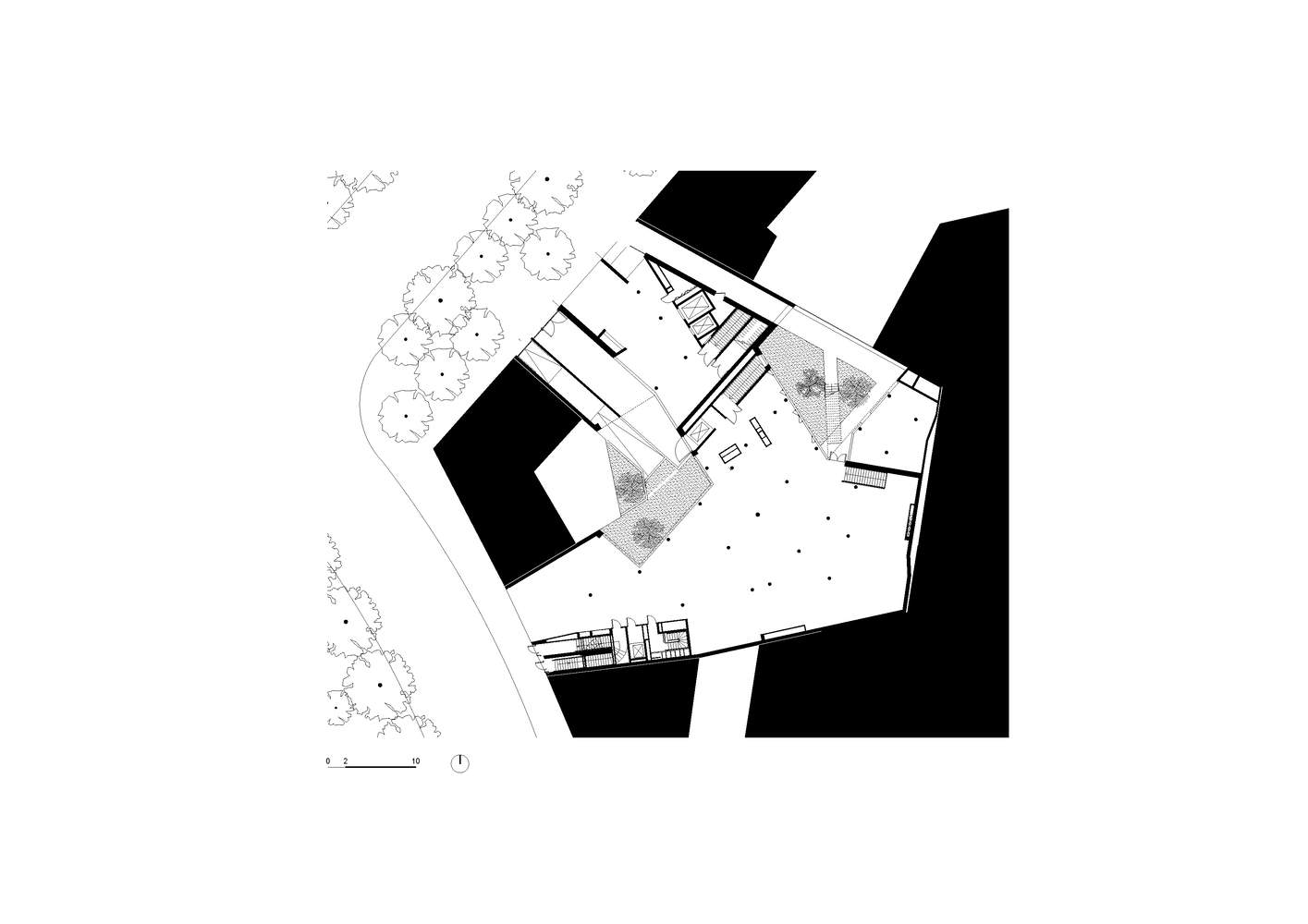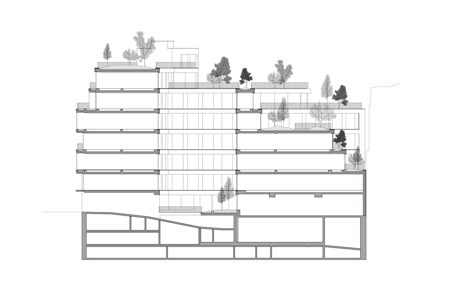 材料和光线-建筑由一种克制的材料调色板定义,强调寿命和感官体验。浅灰色混凝土以水平层浇筑而成,形成了主要的结构表现,巧妙地借鉴了奥斯曼巴黎的石灰岩色调。朝向城市,这些层变得更加碎片化,融入了周围的城市结构。这些表面上的光影游戏引入了一种安静的活力,以应对一天中不断变化的条件。该建筑以光为主要元素。通过玻璃、阴影和材料触感的相互作用来探索透明度、反射和深度。立面在一天中不断演变,捕捉到天空和周围城市不断变化的色调和反射。坚固与轻盈、永恒与短暂之间的对话定义了该项目的身份——一个当代的补充,增强了其历史背景,同时提供了一种永恒的空间体验。
