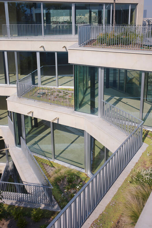 空间和材料构成——该项目通过精心衔接体量和材料与周围环境相结合。大型弓形窗户为关键的城市景观提供了框架,在办公环境中起到了城市的延伸作用。一楼的零售空间增强了城市的活力,其透明的立面加强了与公共领域的联系。沿着Taillebourg大道的一个宽敞、自然采光的入口大厅建立了一个清晰的到达顺序,通往一个垂直的流通核心,通往该场地的景观中心。建筑策略包括适应性,允许未来的空间和程序转变。不同比例的地板营造出动态的室内环境,而与绿色植物的视觉联系丰富了每一层的体验。户外工作空间模糊了室内外之间的界限,强化了嵌入大自然的生活工作空间的理念。