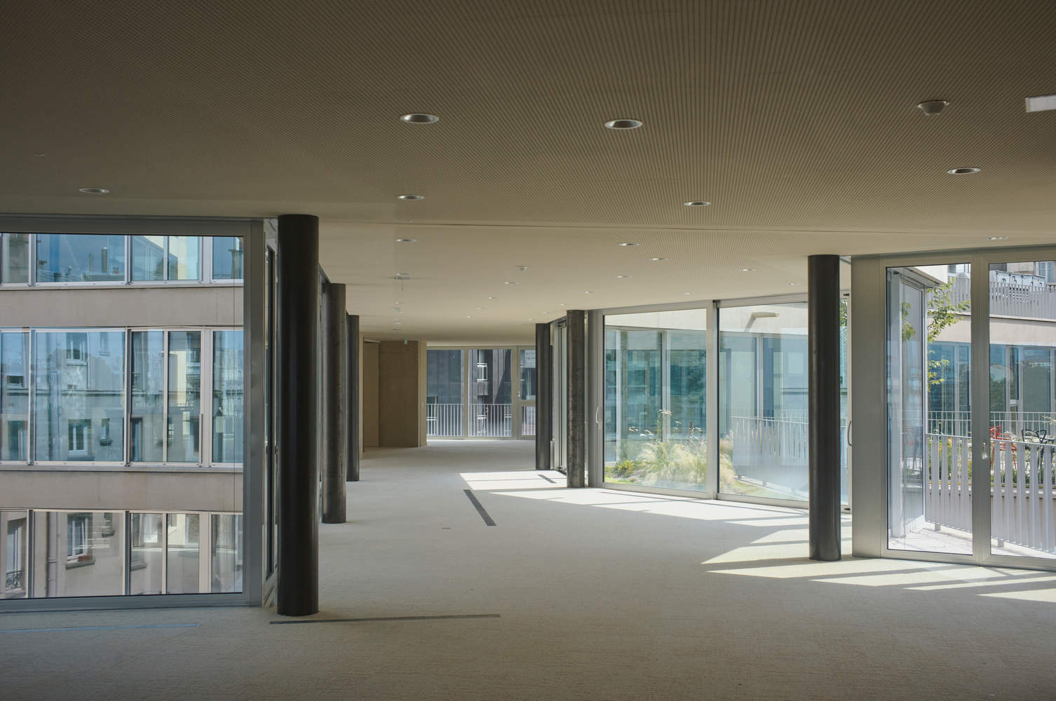 Spatial and Material Composition - The project engages with its surroundings through careful articulation of massing and materiality. Large bow windows frame key urban perspectives, acting as extensions of the city within the office environment. The ground floor retail space enhances urban activation, its transparent façade reinforcing connectivity with the public realm. A spacious, naturally lit entrance hall along Avenue Taillebourg establishes a clear arrival sequence, leading to a vertical circulation core that opens onto the landscaped heart of the site. The architectural strategy embraces adaptability, allowing for future spatial and programmatic shifts. Floor plates of varying proportions generate dynamic interior environments, while visual connections to greenery enrich the experience of each level. Outdoor workspaces blur the threshold between interior and exterior, reinforcing the idea of a living workspace embedded in nature.