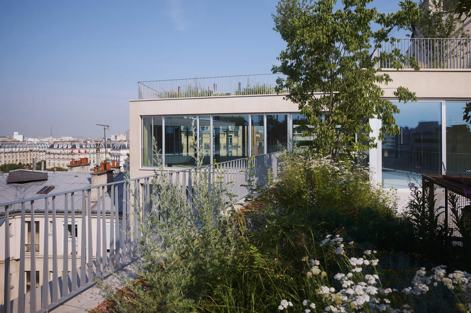Workspaces and Human Experience - The design prioritizes workspaces that foster interaction, visibility, and well-being. A balance of formal and informal meeting areas enhances communication and collaboration. The spatial qualities of the interiors are carefully calibrated, ensuring optimal daylight penetration, thermal stability, and acoustic comfort. The use of high-quality materials and crafted details reinforces a sense of permanence and refinement. A key ambition of the project is the integration of nature within the workplace. Landscaped terraces, totaling 600 m², establish a continuous dialogue between architecture and greenery. Designed in layers that correspond to the building's vertical articulation, these terraces offer varying scales of vegetation, framing views and creating a sense of retreat within the urban setting. The planting strategy follows the guidelines of the City of Paris, selecting native and seasonal species to enhance biodiversity and introduce subtle variations throughout the year.