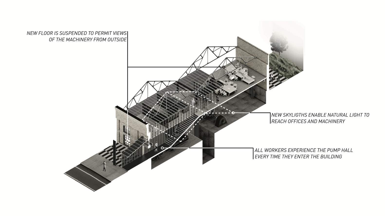 Two specific interventions made the project viable: in the first phase, the capacity of the original gantry crane structure was leveraged to suspend a 'floating floor' above the pump hall machinery, enabling the brick building to be fully repurposed as an office and a restaurant. Second, a zoning amendment was obtained to build a five-story residential building on a 40-foot sliver of land between the heritage building and the street, arguing for a reinstatement of the original industrial streetscape that abutted the former railway line. Along with a second, wider apartment building on the opposite end of the Pumping Station, the residential developments made the project financially feasible while also expressing a distinct historical narrative within a district undergoing major transformation. In contrast to previous attempts, the solution displays the pumping equipment in its found state. The new flexible office floor plate hovers above, providing optimal views enhanced by floor-to-ceiling glazing, constructed efficiently and economically with off-the-shelf materials. New skylights pierce the roof, drawing natural light deep into the expansive space. All entrances encounter the equipment before reaching any newly built components, letting the "found object" form the user experience.
