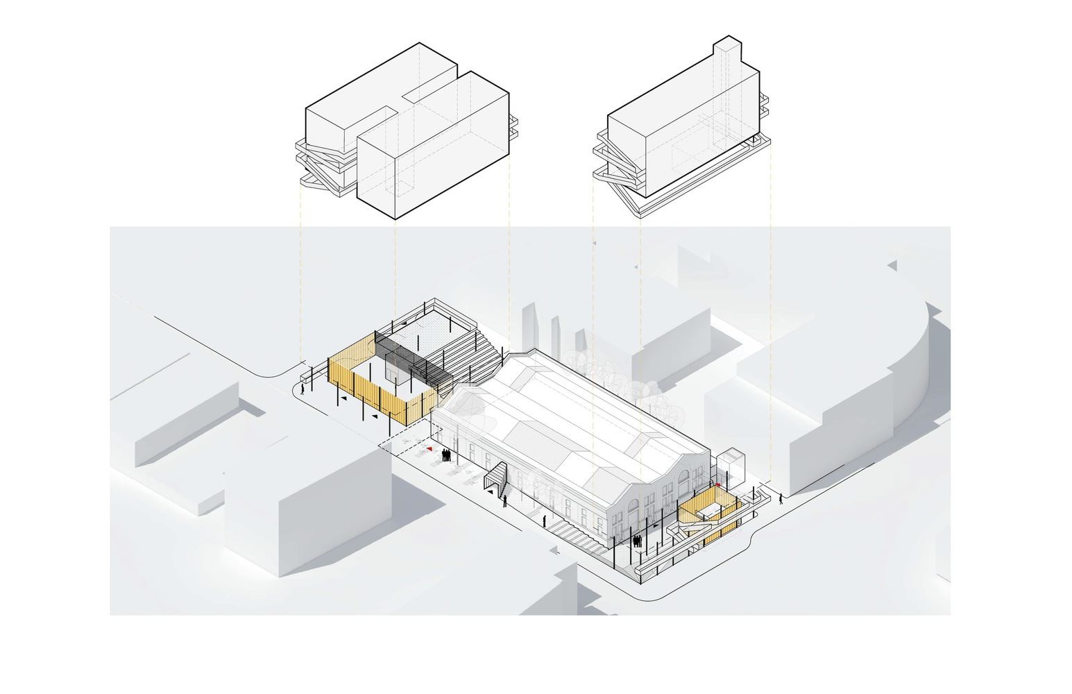 Each of the residential buildings is offset from the existing building, creating new pedestrian lanes that respect the original Pumping Station envelope, reference a human scale, and expand the ground floor commercial frontages. The massing plan highlights connections between the old and the new. Barrier-free access points are nestled along pathways between the historical facade and new residential entrances, and within, moments of compression and expansion feature two outdoor amphitheaters, public plazas, and bridges that circulate residents between the residential blocks and the heritage building. The weaving nature of these passageways extends the winding streets that define the area and integrates diverse forms of public space as an essential component of the project's planning scheme.