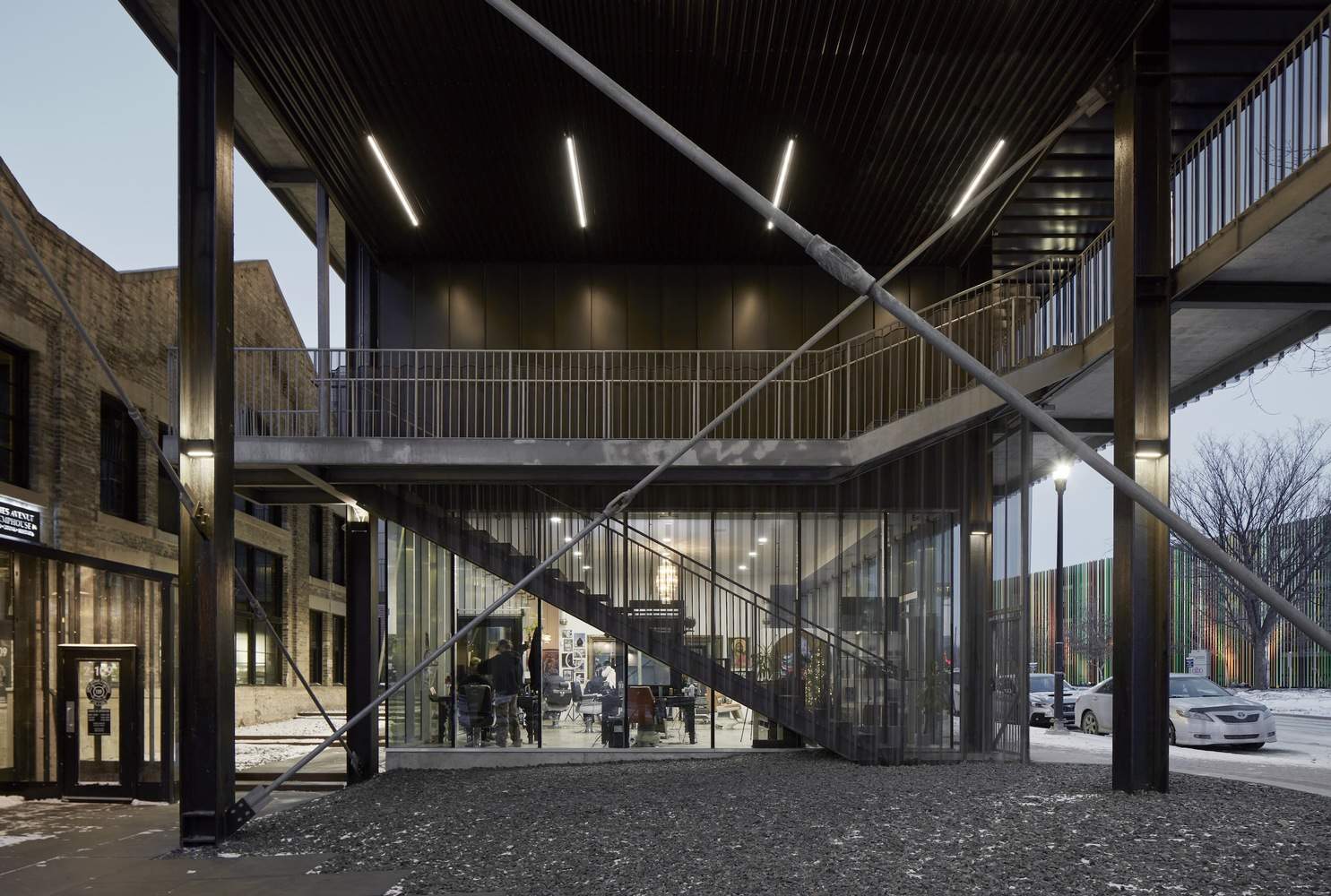 The commercial spaces are grounded in the straightforward industrial quality of the place. The walls are defined by steel studs and stiffening bars that cut the required glazing thickness in half and eliminate the need for skilled installers, which in turn sped up the construction, made it more affordable, and reduced the building's embodied carbon by half. The language of the two residential buildings also builds on the industrial character of the site. They are each elevated on columns that extend the grid of the gantry crane structure and create sightlines to the historic building. The buildings are composed of dual-aspect shotgun apartments and use 100-year-old Nail Laminated Timber (NLT) technology as the floor and ceiling structure, taking precedent from warehouse construction prevalent throughout the Exchange District.