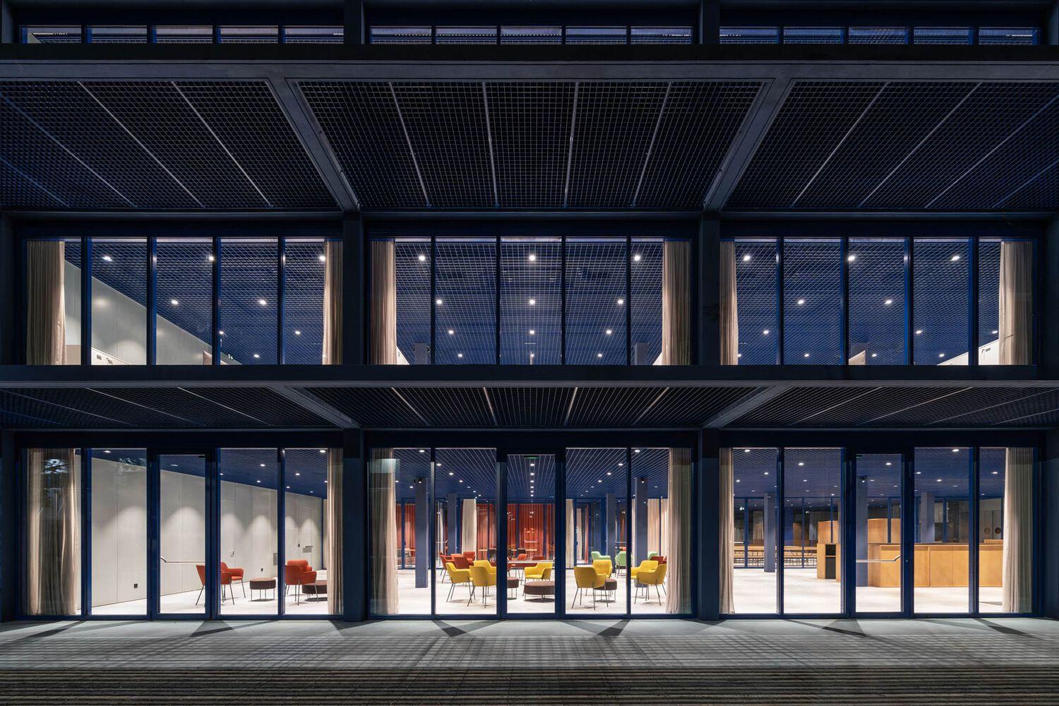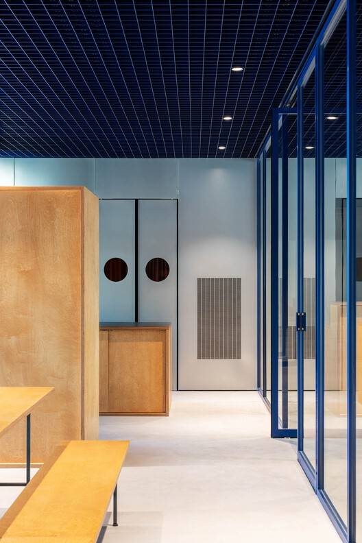 一楼是会议、展览和其他活动的多功能区,而上层则是适应性强的办公空间。移动墙壁和模块化元素允许快速重新配置会议区域,而玻璃和织物设备则作为视觉和听觉的分隔物,有助于重新定义大型开放空间。该设计包括用于私人通话和安静工作的僻静场所,与开放的展览空间融为一体。模块化的办公桌和货架系统允许定制隐私级别,为工作、讨论想法、坐下以及最重要的社交提供了壁龛。一个排列整齐的机械系统,隐藏在模块化金属格栅后面,带来了现代工业的活力。布局的灵活性支持各种工作方式,满足员工的个人需求,同时也使组织能够快速适应市场或劳动力的变化。