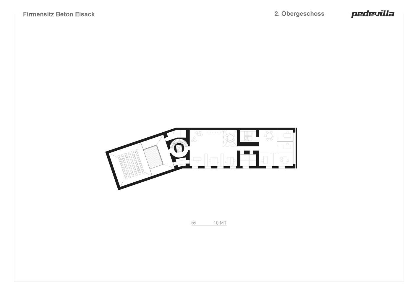 The building is accessed through a spiral staircase that rearranges the entrance situation in a central location. A future- and demand-oriented mix of open-plan and individual offices with various meeting options for staff and managers extends over two floors of the levitating volume.