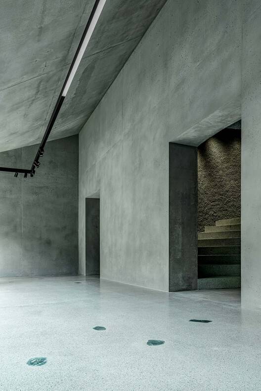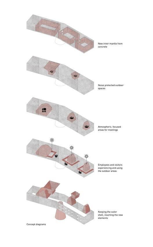 该项目是一个身份形成总部,根据“从灰色到绿色”的座右铭解释2002-2022年的转型,并利用各种具体技术来实现。由于其既定的“品牌信息”,现有的灰色混凝土外壳保持不变。另一方面,室内的特点是主要使用具有各种表面结构的绿色轻质混凝土,以及黑钢和玻璃。