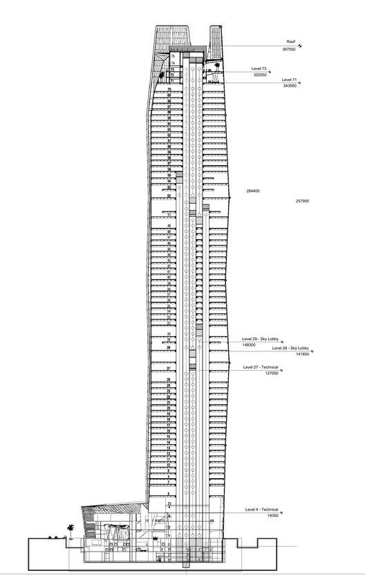 该项目提供约185000平方米的地面以上总建筑面积,包括公司和商业办公空间、最先进的450个座位的礼堂、用餐区以及54层的健身中心和游泳池。较低的地面层和三个完整的地下室层可容纳支持功能和中央厂房和设备区。项目业主资本市场管理局将在塔楼顶部占用约40000平方米的建筑面积。剩余的办公空间将用于商业租赁。