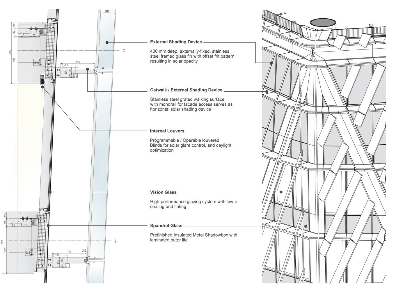 A high-performance solar control system installed moderates the intense light and heat of the local environment. An external layer of fins, gantries, and perforated panels provides shade, enhancing the thermal efficiency of the triple-pane glazing. The shading devices are oriented to minimize solar gain and internal cooling loads thereby saving on the size of the HVAC installation and reducing energy costs. Electrical energy will be re-claimed through the photovoltaic installation on the roof of the Tower.