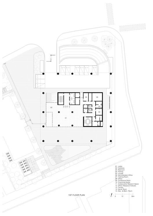 Ultimately, the hierarchy on each floor plan extends from private and secure areas to public and open spaces, linking resident companies (Private/Secured), shared office space in the core zone (Semi-Private/Semi-Secured), shared spaces (Public/non-secured), and external spaces. This approach is also applied in the cross-section, where shared spaces on two floors are combined to expand sightlines and circulation between floors. This is linked to a void that penetrates the entire floor, regulating lighting, temperature, and humidity, reducing energy consumption while providing a comfortable indoor environment.