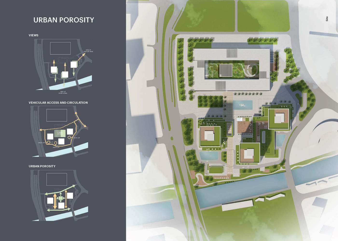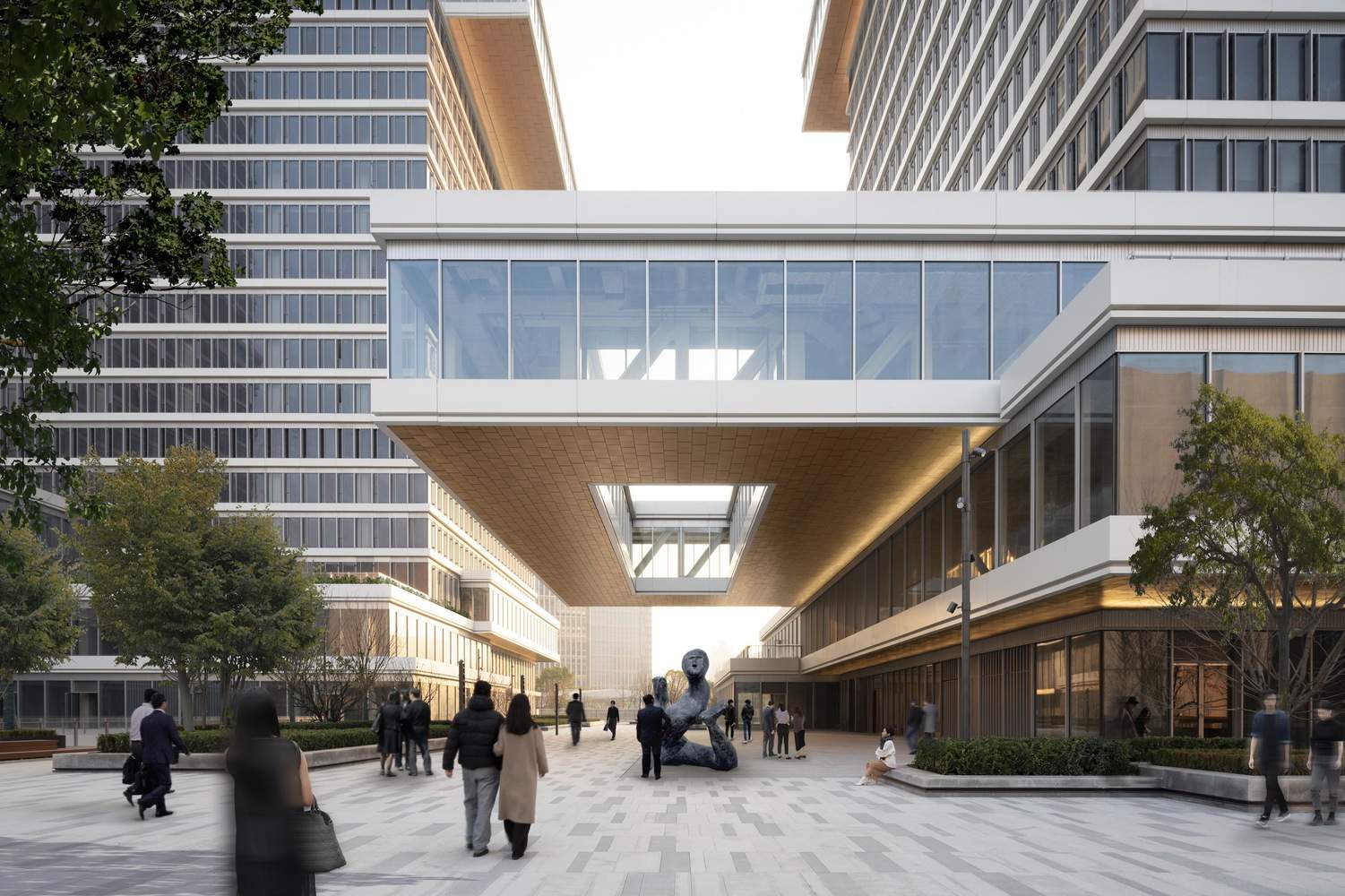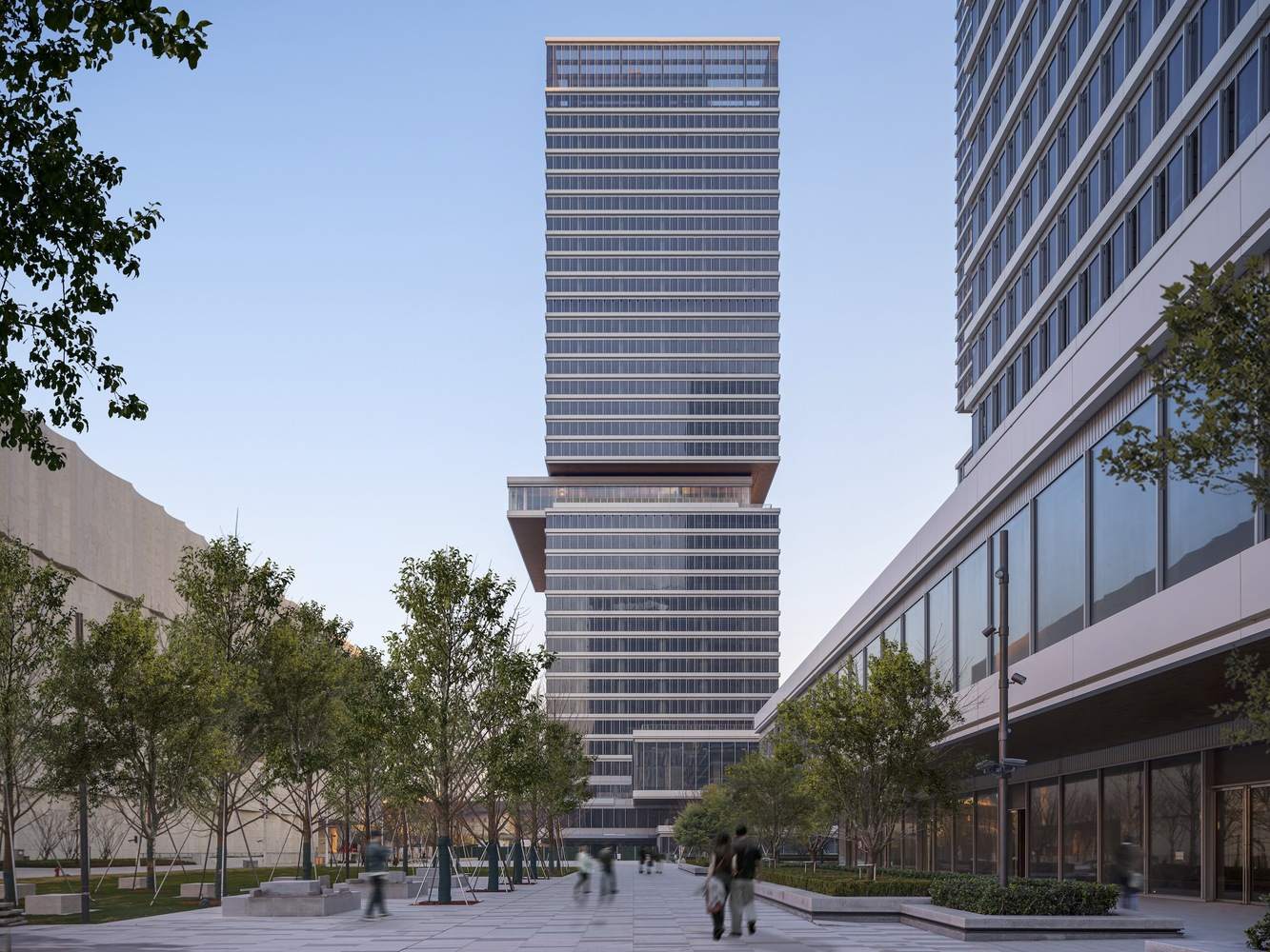 A critical move for the project is its reorganization of vehicular circulation. By relocating traffic to an outer loop, the design liberates a central plaza that redefines pedestrian connectivity between the towers, museum, and waterfront. This spatial strategy allows the podiums to engage directly with the urban context, with terraces formed through shifted slabs that guide visitors to key programmatic elements. The terraces simultaneously provide green spaces, fostering a biophilic connection for users while offering expansive views of the surrounding city. "The urban significance of this cluster of buildings goes beyond its office function," Says KPF President James von Klemperer, FAIA. "The complex combines with a major museum to create cultural spaces that elevate the aspirations of the city."