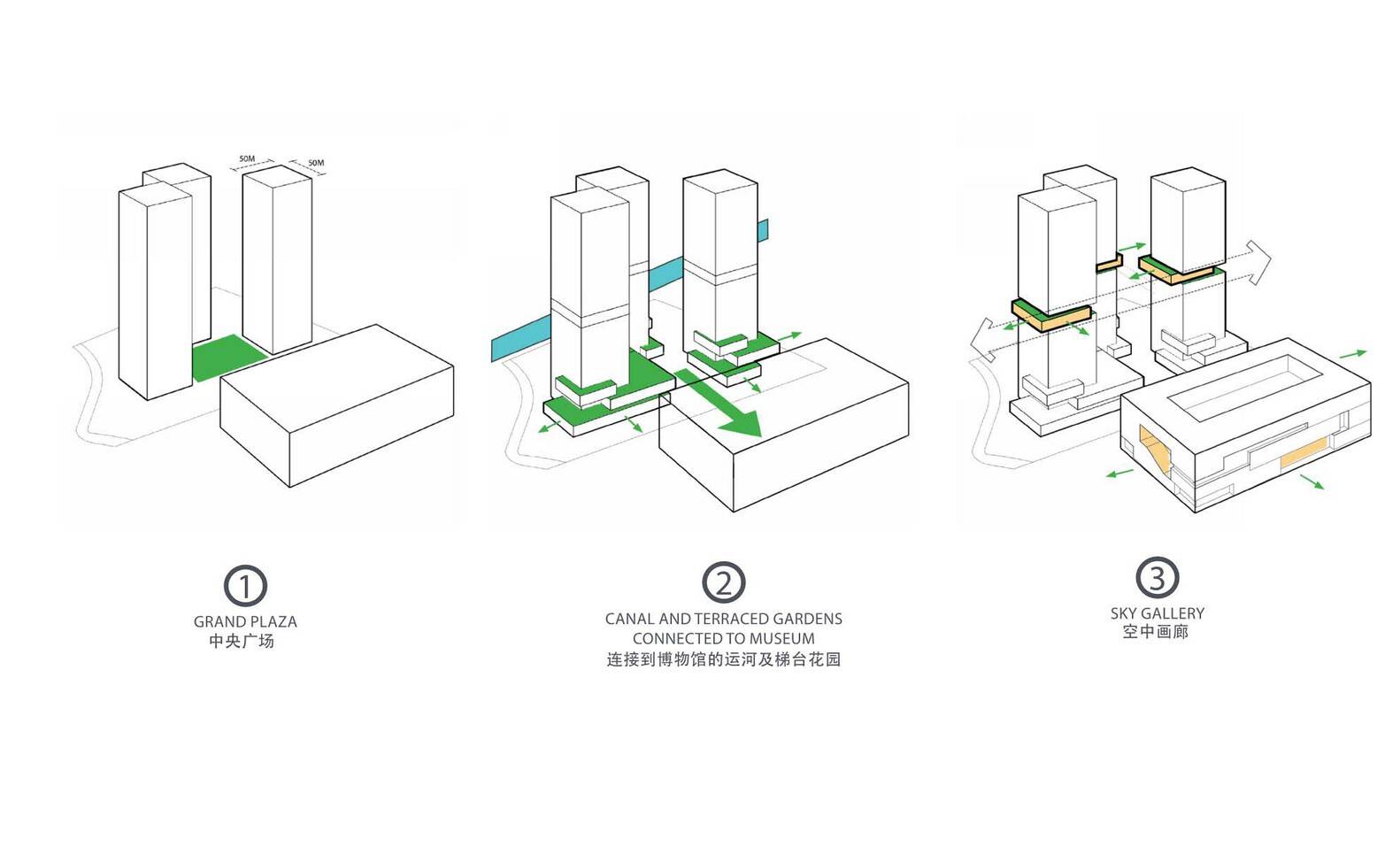空间与交通的优化:该项目在空间组织和交通规划方面表现出色。通过将车辆交通重新安置到外环,设计解放了一个中央广场,重新定义了塔楼、博物馆和滨水区之间的行人连接。这种策略不仅提升了空间的互动性,还通过露台和绿地为用户创造了亲生物的联系,同时提供了广阔的城市视野。这种设计超越了传统办公功能,成为提升城市文化空间的重要组成部分。