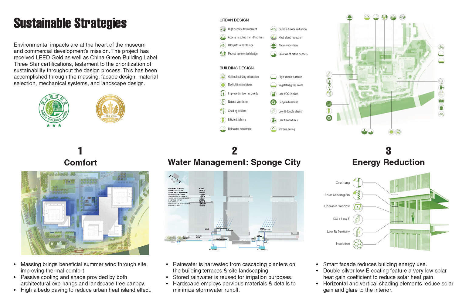 可持续性是项目概念的组成部分。雨水收集系统捕获雨水用于灌溉和冷却应用,而植被屋顶则可以减少径流,增强隔热性,减少城市热岛效应。滨水景观的设计是为了应对由于恶劣天气事件频率增加而增加的洪水风险,从战略上允许某些区域被淹没,而其他区域则保持完整。热电联产系统与吸收式制冷机相结合,通过将废热转化为电能、供暖和制冷来优化能源效率。这些措施体现了对环境响应设计的承诺,最大限度地减少了项目的生态足迹。