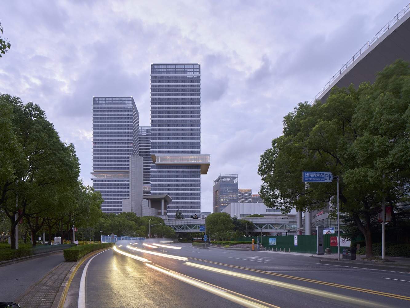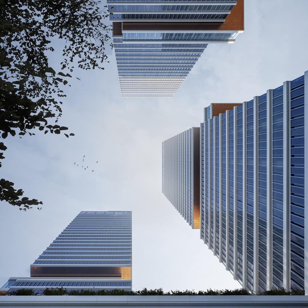 建筑师提供的文字描述作为文化和商业的融合,花木地块10-峰会通过重新激活废弃的河滨,培育新的公共空间,并通过悬挑的空中画廊将其三座塔楼与相邻的博物馆合并,重新构想了参与式城市化。该项目地理位置优越,毗邻世纪公园和黄浦江,将以前被忽视的河滨变成了一个活跃的城市领域。KPF设计负责人、FAIA的Jeffrey Kenoff解释说:“该项目旨在颠覆塔楼的方程式,通常包括一个标志性的顶部,而是将画廊程序用作塔楼中点的悬挑体量。”。“其结果是,这是一个与步行领域相结合的时刻,同时在上海天际线中塑造了该项目的身份。”悬挑的天空画廊被照亮,并覆盖着反光和锤击的钛形拱腹,加强了它们在城市结构中的空间突出性,并为该项目在天际线中的独特身份做出了贡献。