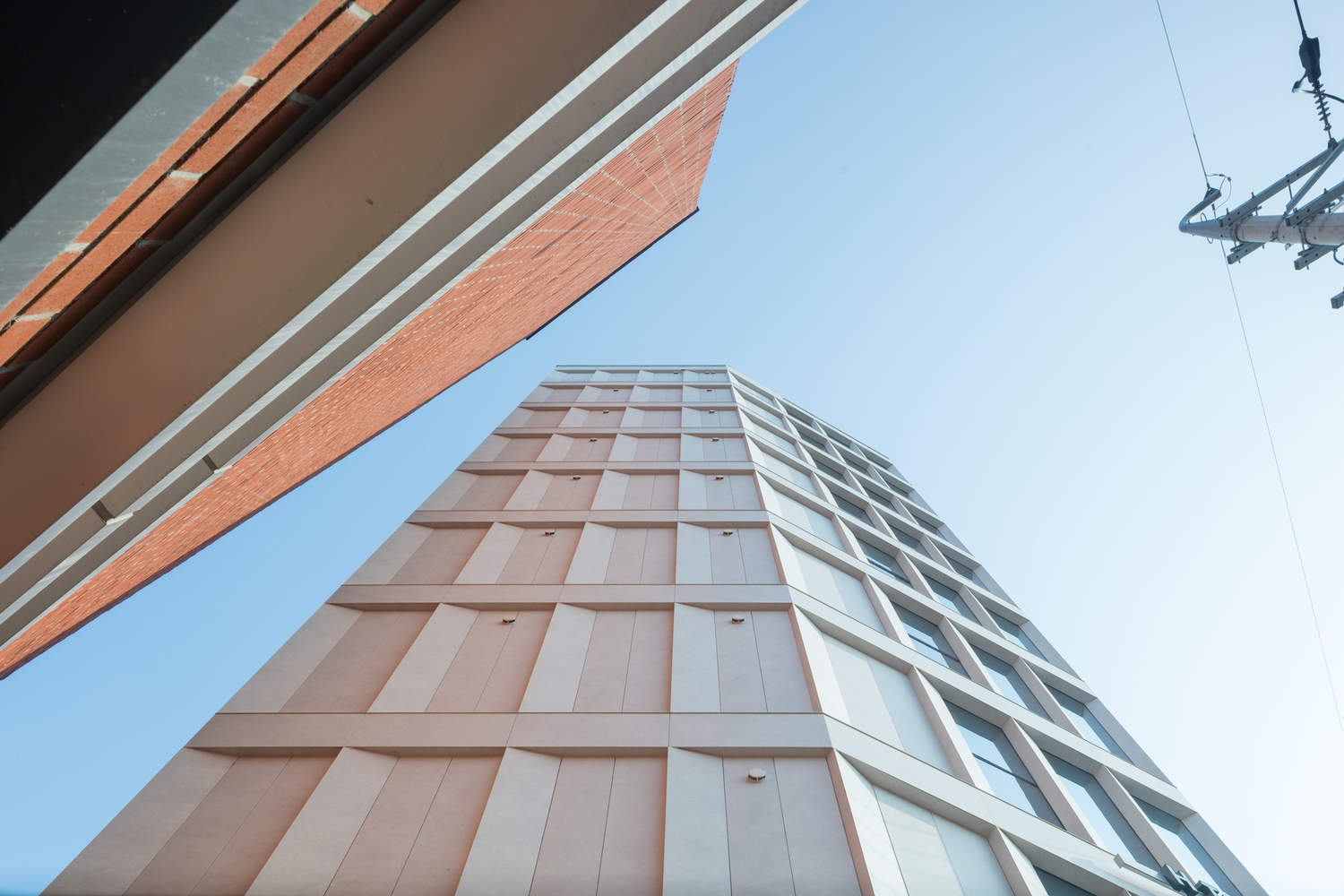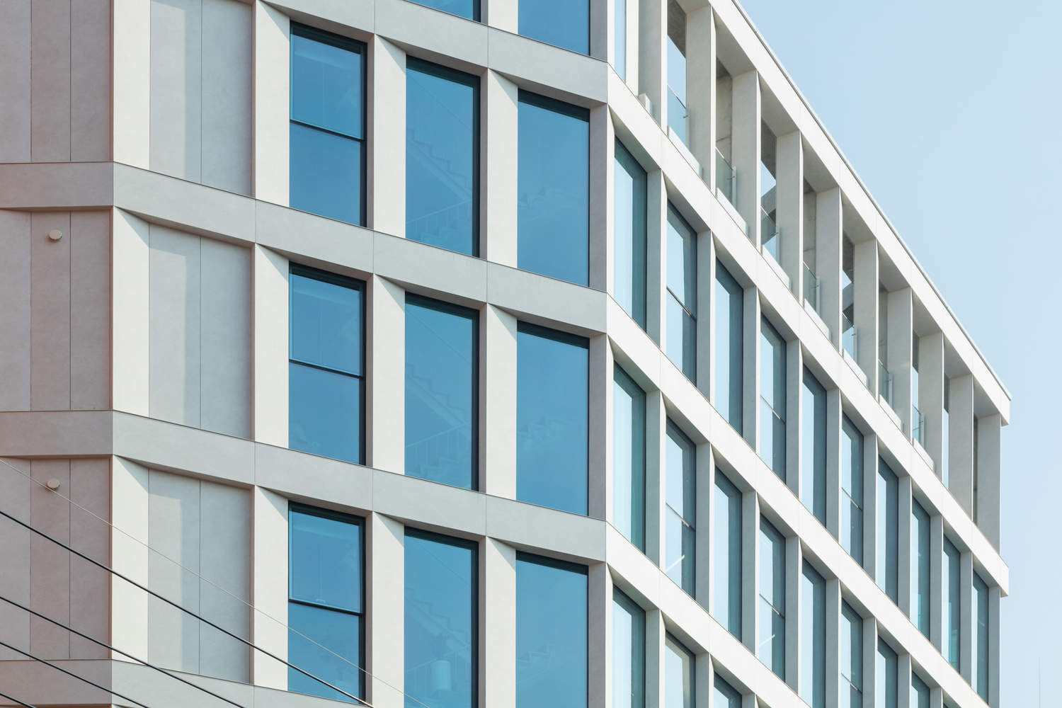 Laminated ceramic tiles were chosen for their ability to cover large areas with a single, seamless layer. This material not only enhances the façade's sleek aesthetic but also adds texture and character, especially when juxtaposed with the floor heights.
