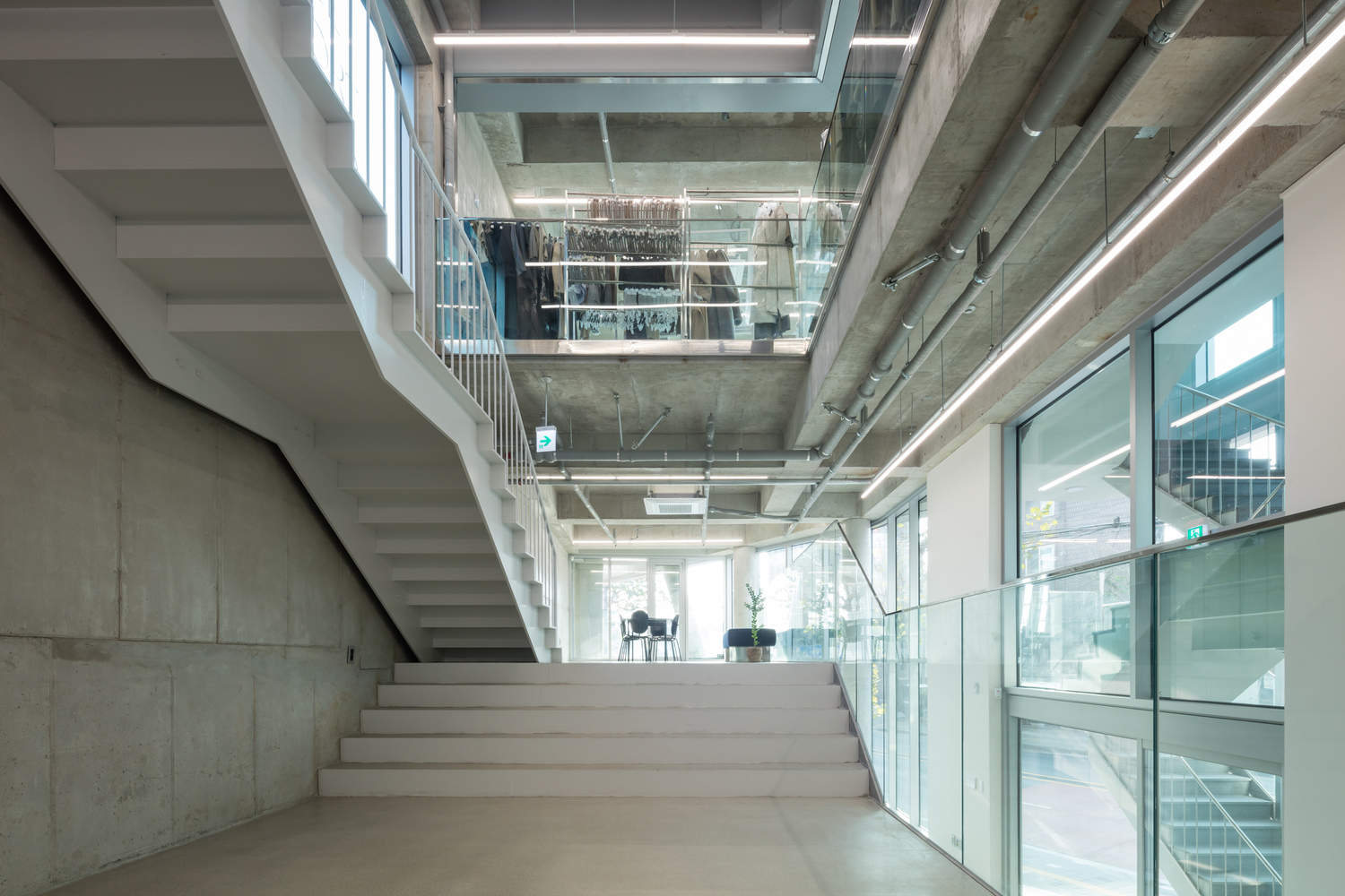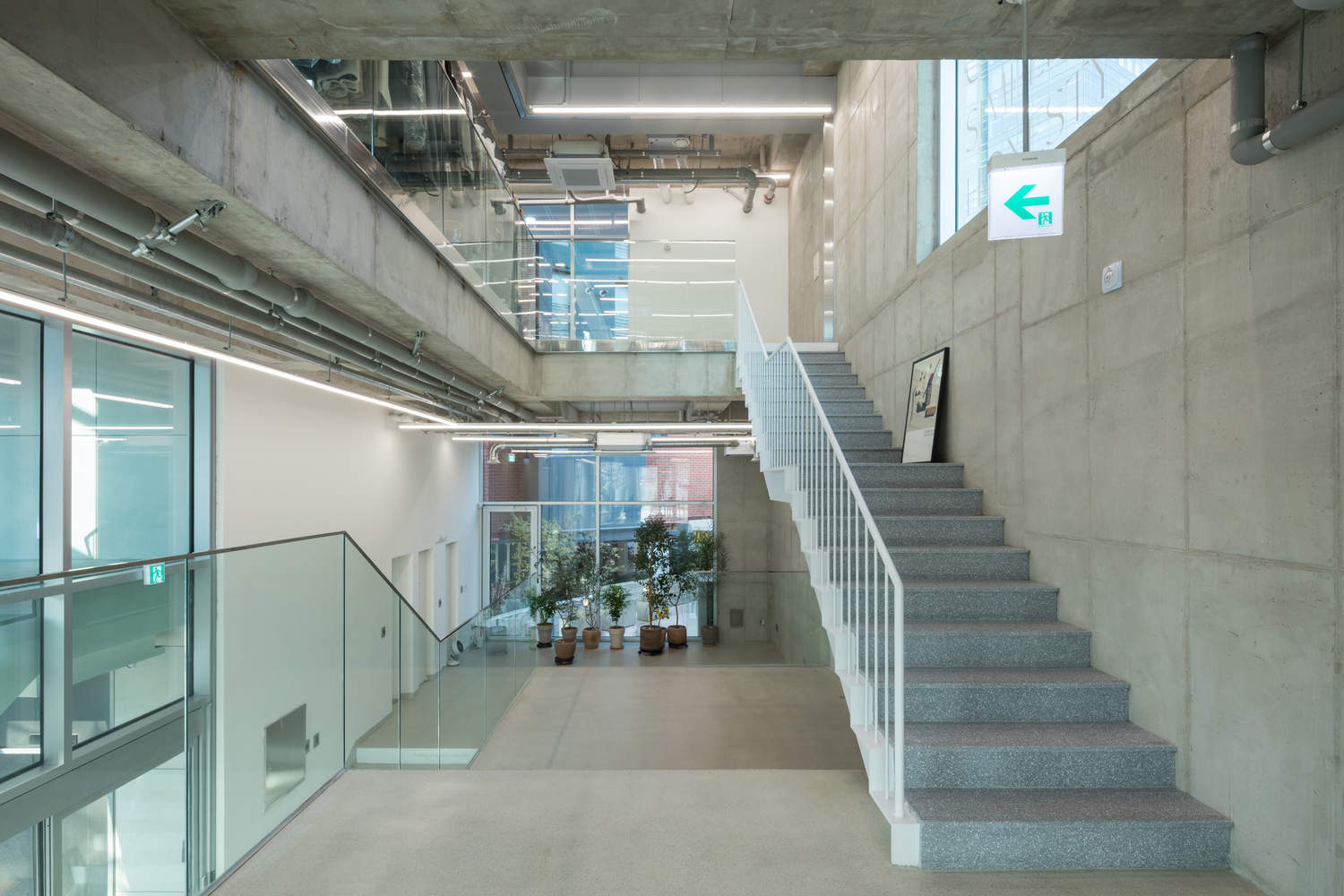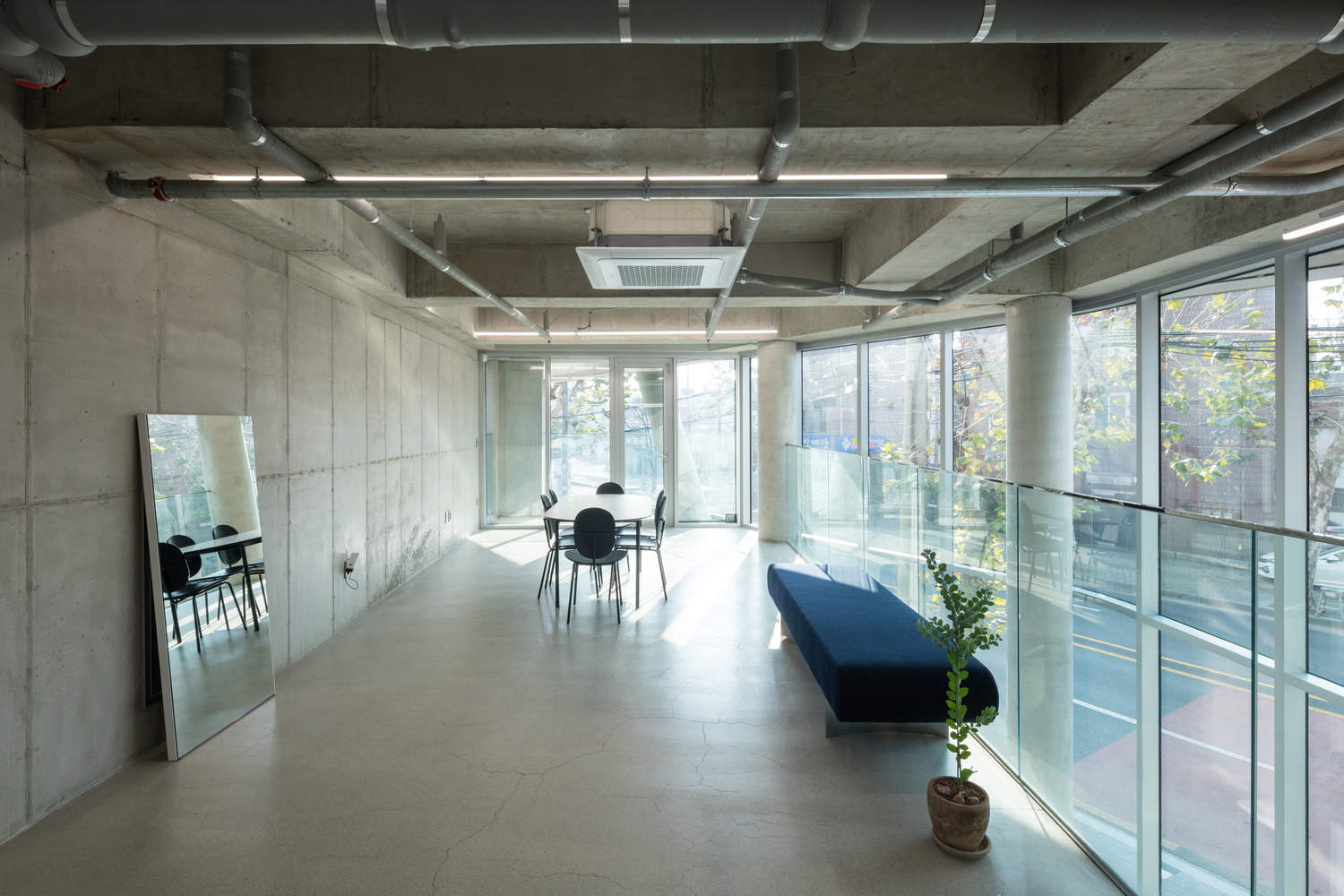 With a floor area ratio of 400%, parking presented a critical issue. To resolve this, various mechanical parking systems were analyzed to find the optimal solution. By redesigning the original CIP (Cast In Place Pile) layout, additional width was secured to accommodate parking. The parking entrance, whimsically referred to as the "Boa Snake," seemingly consumes vehicles, leading to a functional sequence of ramps and stair landings that integrate parking with the first-floor space. This floor, currently used as a showroom for a fashion company and a venue for pop-up events, demonstrates a creative adaptation of spatial constraints.