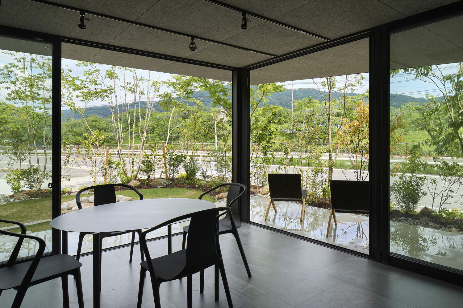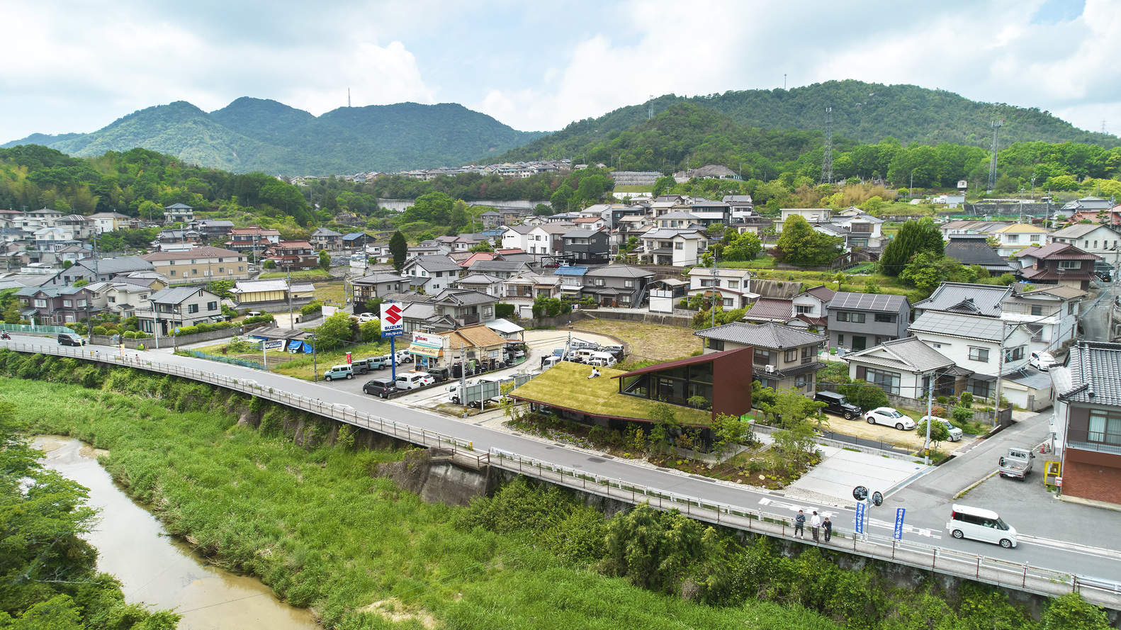 Text description provided by the architects. The site is located in the mountains of Kure City, Hiroshima Prefecture, with a reservoir called Honjo Suigenchi to the east and Niko River leading to Kure Bay in front of it. To the west are a series of mountains centering on Mt. Ege, and at the foot of the mountains, old and new houses stand side by side along the contour line. The owner, who has been running a construction company in the area for a long time, had a strong desire to create a building that would contribute to the local community, and in addition to the functions of office and residence, he wanted the building to serve as a "meeting place" for the community.
