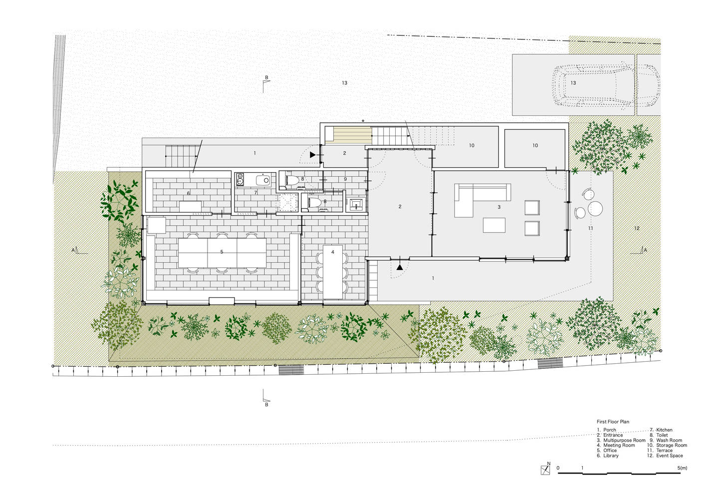 In order to extend the function of a construction company, a multi-purpose room was placed so that it is connected to the garden on the first floor. By moderately adjusting the line of sight through plantings rather than a wall, the lively atmosphere of the users is brought to the community. The multipurpose room is planned as a place to support various activities of local people and also as a disaster prevention center. The grass roof of the shed not only reduces the heat load inside the building but also opens the building to the local community in early spring when the riverside is lined with cherry blossom trees. The plan is to add a "meeting place" to the work and residence using the entire building.
