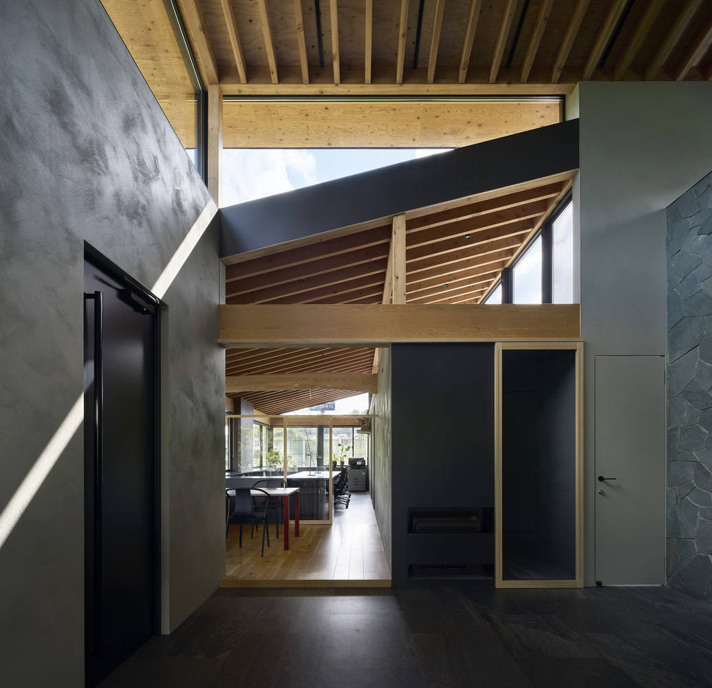 建筑师提供的文字描述该遗址位于广岛县吴市的山区,东面有一个名为本条水原池的水库,前方有通往吴湾的尼科河。西面是以埃格山为中心的一系列山脉,在山脚下,新旧房屋沿着等高线并排而立。业主在该地区经营了一家建筑公司很长时间,他强烈希望建造一座对当地社区有贡献的建筑,除了办公和居住的功能外,他还希望这座建筑能成为社区的“聚会场所”。