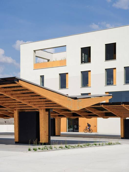 Text description provided by the architects. The investors of the BudexHUB project have a strong personal and business interest in sustainability, innovation and design. They are pursuing their businesses in areas that are directly related to the topic, such as photovoltaic panels or robotic agriculture, and are die-hard fans of electromobility. From our point of view, there was no doubt that using a solid wood panel construction was the right decision. The BudexHUB office building reached the maximum height limit in the Czech Republic and was completed in the second half of 2024 as the tallest Czech wooden administrative building.