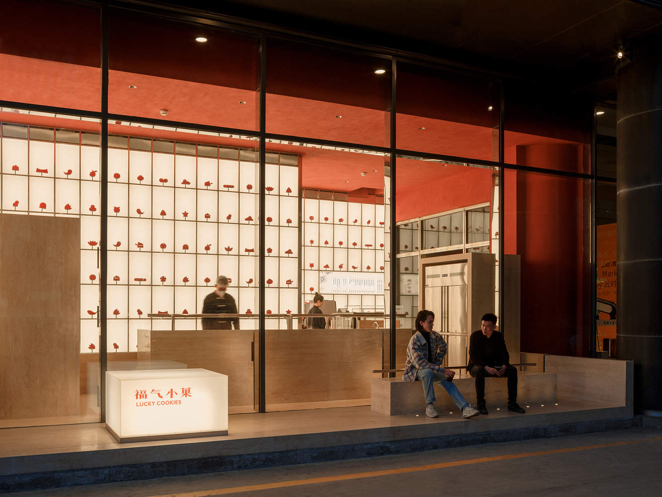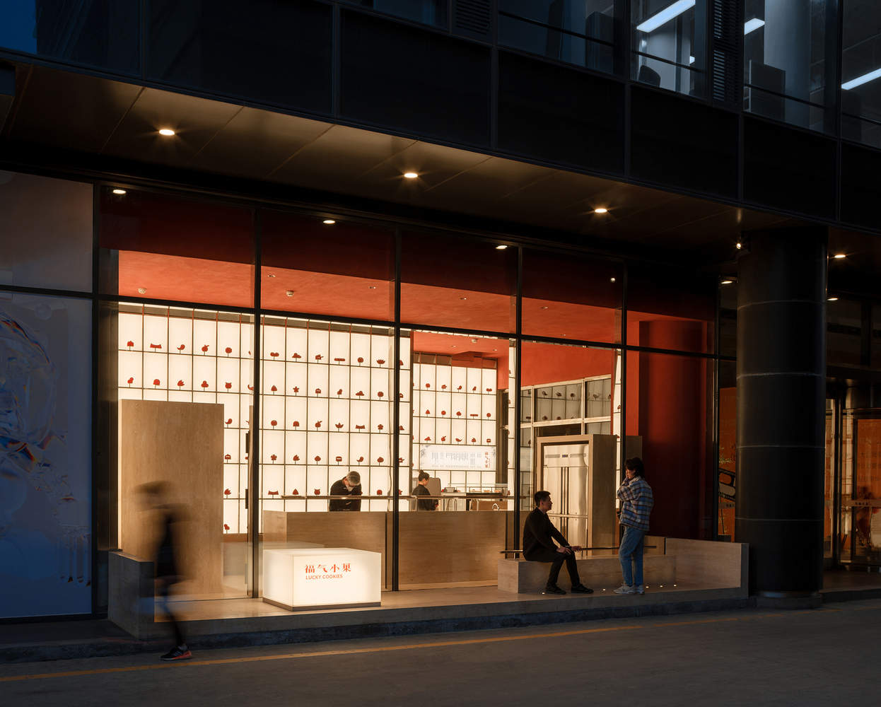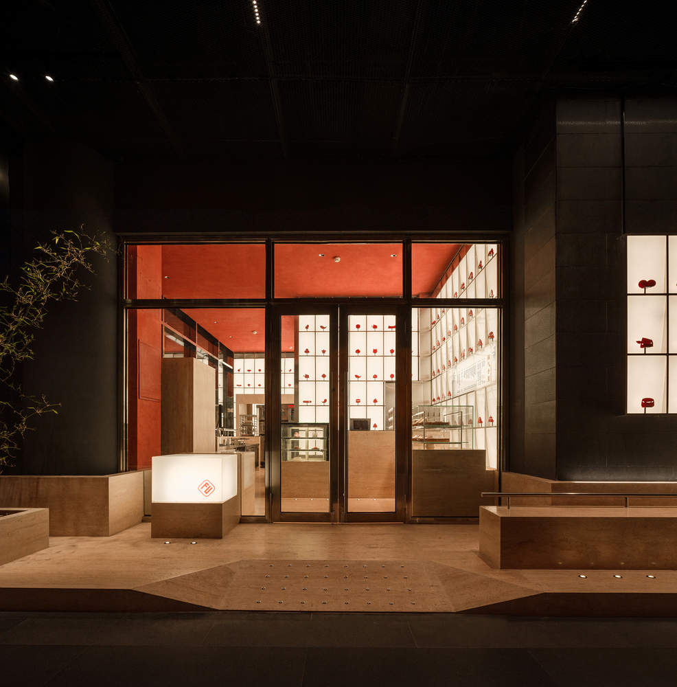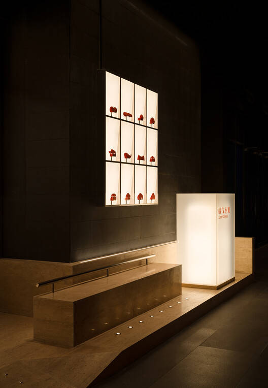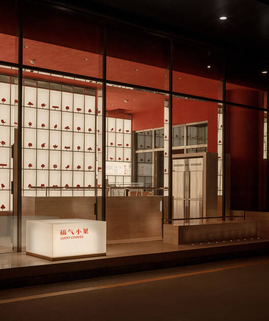 Text description provided by the architects. The Lucky Cookies is a bakery specializes in traditional Chinese pastries. Located on the first floor of the famous Beijing Longfu Building, the site is a north-facing street shop with an area of only 37㎡. While the floor height reaches 5.7m, the main depth of the site is just less than 3m. The site's nearly 1:2 bottom-to-height ratio and its full-height glass curtain wall façade compress the store into a "display window": the entire interior space is visible at a single glance.