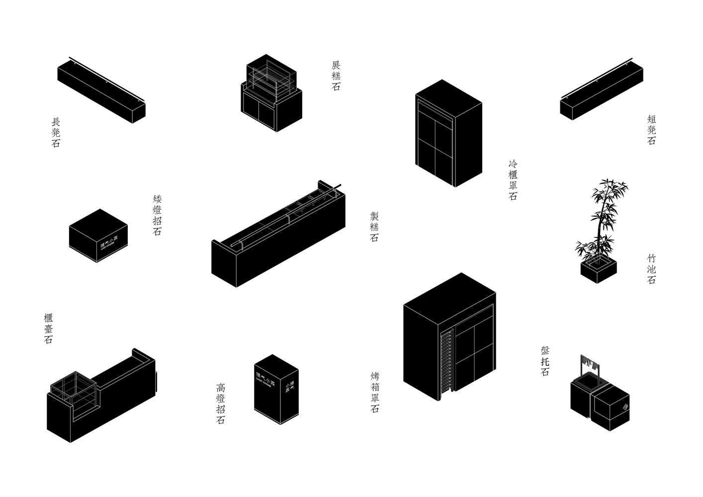 为了进一步增强室内外的融合效果,我们设计了一系列同构家具——“石头”,以方便面包房所需的所有功能——设备棚、准备台、收银台、展示柜、长凳、灯箱标志、竹池等。它们像从平台上生长的“岩石”一样散布在面包店周围,用相同的材料和相似的形状模糊了场地的边界,在有限的深度内创造了丰富的层次,并使内部空间溢出到外部。因此,从场地深度一直到立面的大型厨房设备不再显得拥挤。