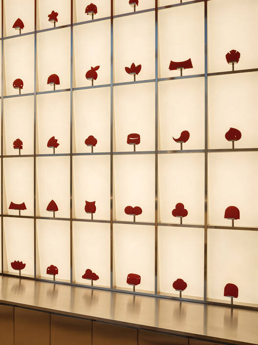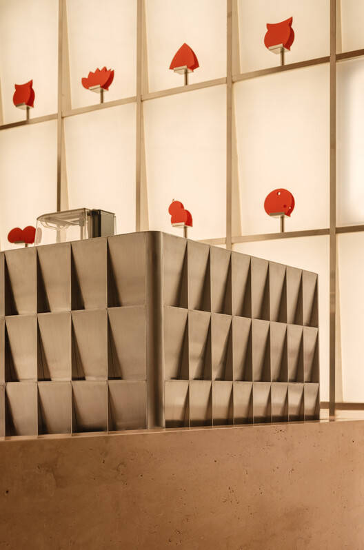 We made full use of the zigzag wall that occupies the largest visual area of the "display window" and designed a 15-meter-long "light screen" to fully catch pedestrians' attention. Specially invented for this project, the 243 prefabricated modular lightboxes on the "screen" are detachable, embedded in the stainless-steel grid by magnetic connections for future easy replacement and maintenance. The front of each lightbox is an inwardly inclined surface to leave space for a little bracket displaying the "paper-cut pastries" at the bottom of each grid. The paper-cuts are made according to the silhouettes of actual pastries sold by the bakery. While the "rocks" horizontally break the site's boundary, the "light screen" vertically utilizes the site's height advantage and north-facing character, counteracts the reflection on the facade glass, and highlights the spatial layers of the "rocks" as a background further connecting the interior space to the outside.