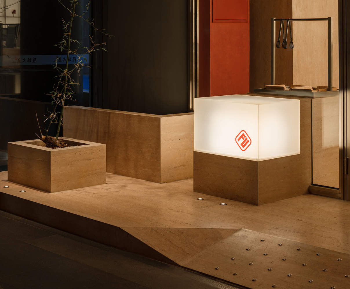 室内外融合与设计细节:设计通过150毫米高的洞石平台连接室内外空间,隐藏幕墙底部框架,并用不锈钢镜面减少边界感,使内部空间自然延伸到室外。此外,设计了一系列同构家具——“石头”,模糊了场地边界,丰富了空间层次。这些设计细节不仅解决了空间狭窄的问题,还创造出独特的空间体验,让顾客在有限的空间内感受到开阔与舒适。