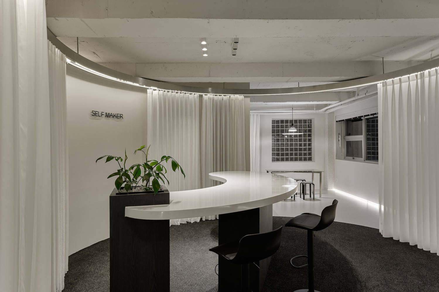 空间布局的巧妙性:SELF MAKER展厅的空间划分极具创意,设计师将办公室、休息室和窗帘展示区巧妙地安排在三个圆形区域内,通过地板、墙壁和天花板的结构划分,实现了功能与美学的完美结合。入口走廊两侧的丝绸窗帘不仅作为门的替代品,还与照明和缓冲墙相结合,为顾客营造出舒适且富有层次感的空间体验。这种布局方式不仅优化了空间利用率,还通过柔和的曲线和材质的巧妙运用,引导顾客的自然流动,体现了设计的细腻与人性化。
