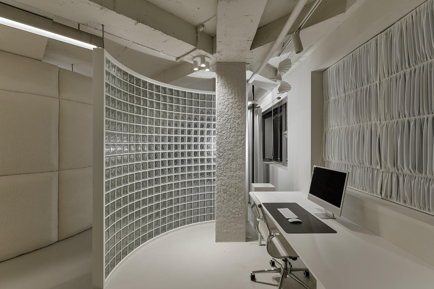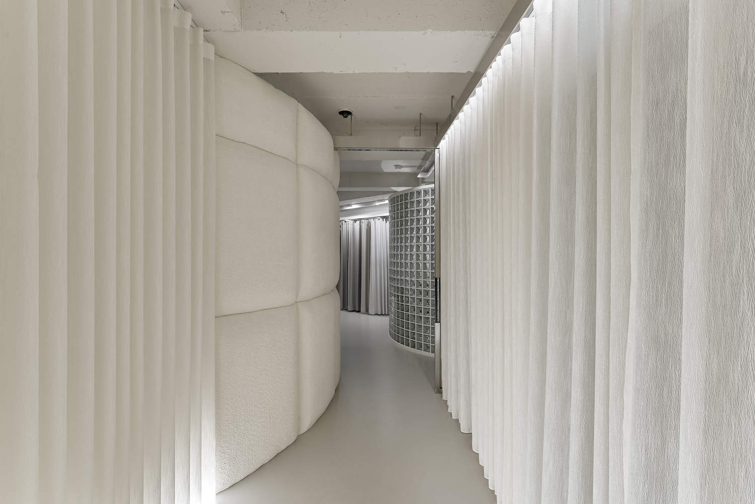 Thin soft and silky curtains installed on both walls of the entrance corridor serve as doors for offices and storage, while at the same time giving customers a comfortable feeling along with illumination and cushion walls, and the cushion wall in the curtain showing zone is the brand's iconic art wall that represents the texture and volume of the fabric. In addition, the office wall is finished with glass blocks at the point of entry and exit, and the cushion wall in the curtain showing zone provides a slight gap to induce the customer's natural flow of movement.