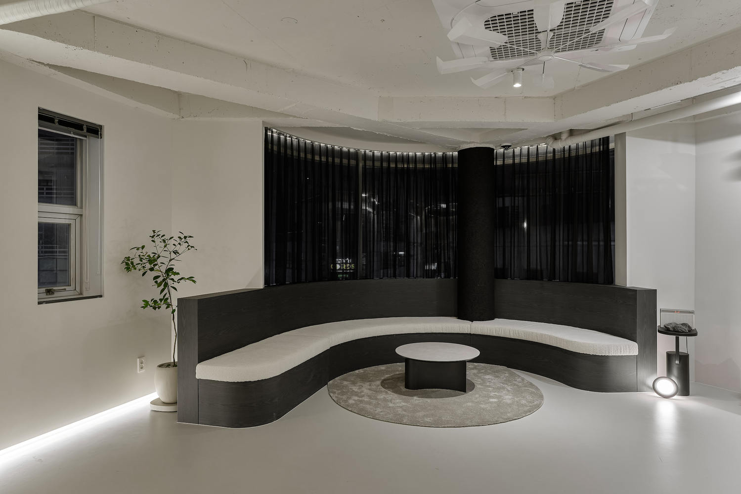 The curtain shoring zone is an important functional device that allows professional and sensory consulting in space while dividing the area through the materials of the floor and wall. It not only allows two circular structures of different diameters to serve as lighting and curtain rails and flexibly partition the space but also allows customers to experience various things by themselves by overlapping individual or two or more products.