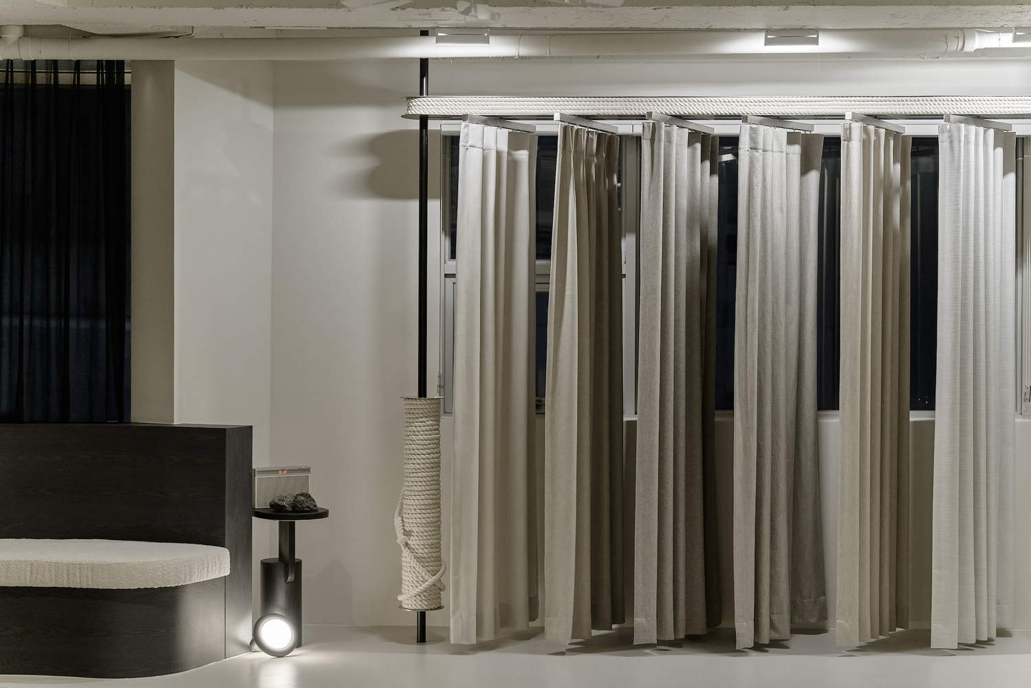 幕墙支撑区是一种重要的功能装置,它允许在空间中进行专业和感官咨询,同时通过地板和墙壁的材料划分区域。它不仅允许两个不同直径的圆形结构作为照明和窗帘轨道,灵活地分隔空间,还允许客户通过重叠单个或两个或多个产品来体验各种各样的东西。