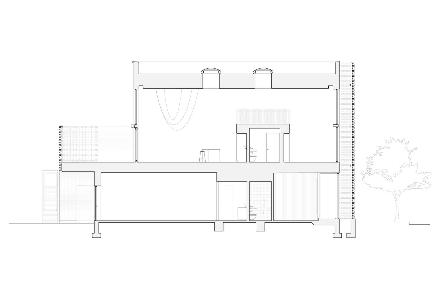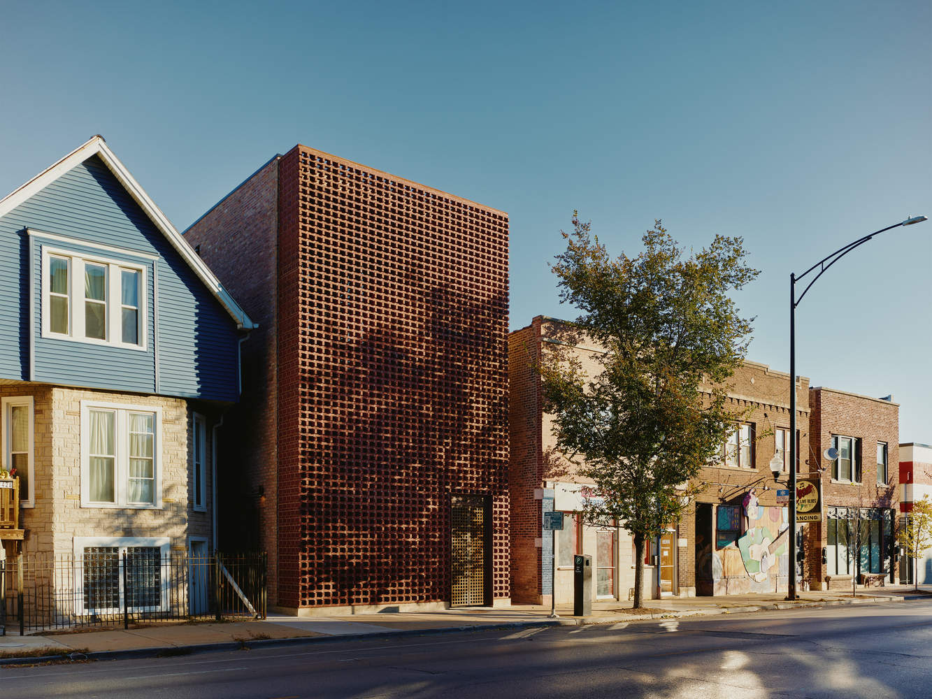为了扩大体积,普通砖承重墙垂直延伸,由于靠近建筑红线,这些墙上不允许有开口。因此,光线仅限于建筑物面向街道和庭院的边缘。借鉴芝加哥面砖正面和普通砖侧面的历史模式,赤陶色铺路砖被用作街道上的砖屏风。这创造了一个独特的、与环境相关的立面,过滤了自然光,从而减少了直接朝南的制冷负荷。在建筑面向庭院的一侧,用普通砖制成的砖屏风改造了二楼的露台,延伸了空间的感知边缘。一扇双折玻璃门可以折叠起来,将可用区域延伸到露台。