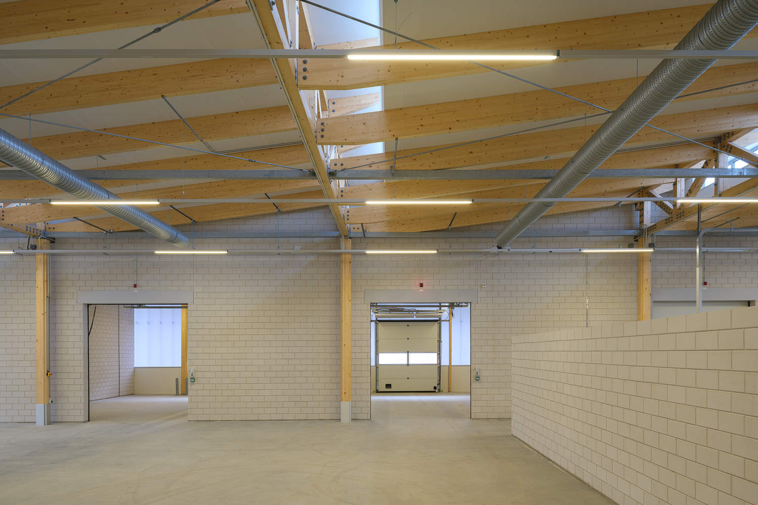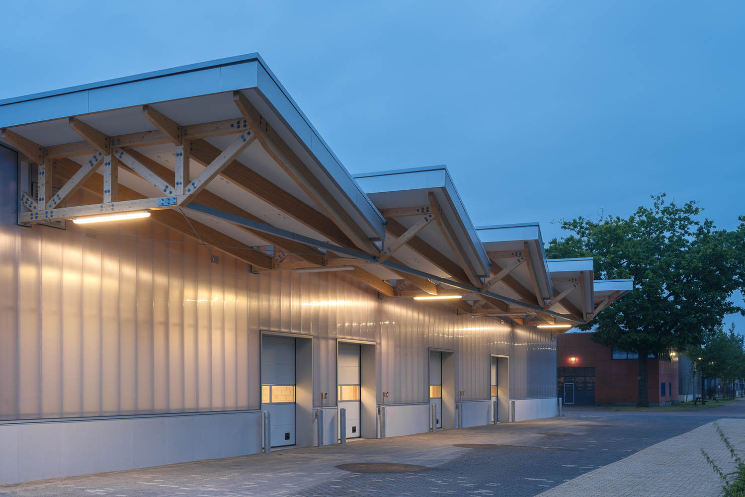The work building consists of three zones; expedition, (grocery) shop and supporting / supervision facilities. In order to make the flexibility and adaptivity capacity of the building as great as possible, the construction consists of trusses with a large span within which the space can be freely divided. Facades and interior walls are not load-bearing and can be modified quite easily. Stability of the construction is generated by cross-braces in two directions between the columns. On the side of the expedition areas, the trusses form a canopy with a generous overhang under which loading and unloading can take place in a dry and sheltered environment.
