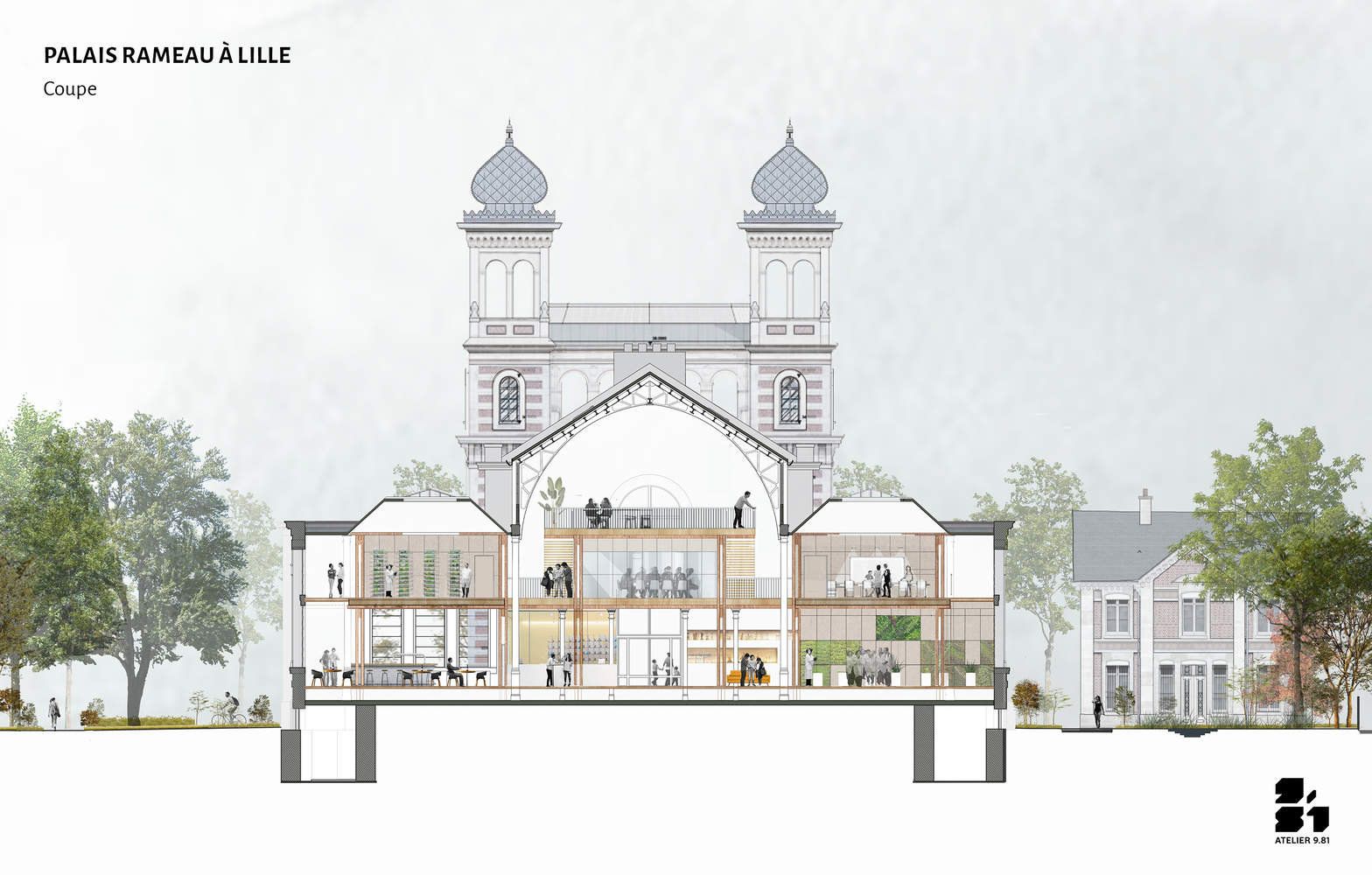 建筑师提供的文字描述Text description provided by the architects. An emblematic building in Lille, the Palais Rameau was built in 1878 thanks to the legacy of Charles Rameau, President of the Lille Horticultural Society. The project was entrusted to Lille architects Auguste Mourcou and Henri Contamine. Its architecture, based on the principle of a horticultural greenhouse, combines regional and oriental influences.