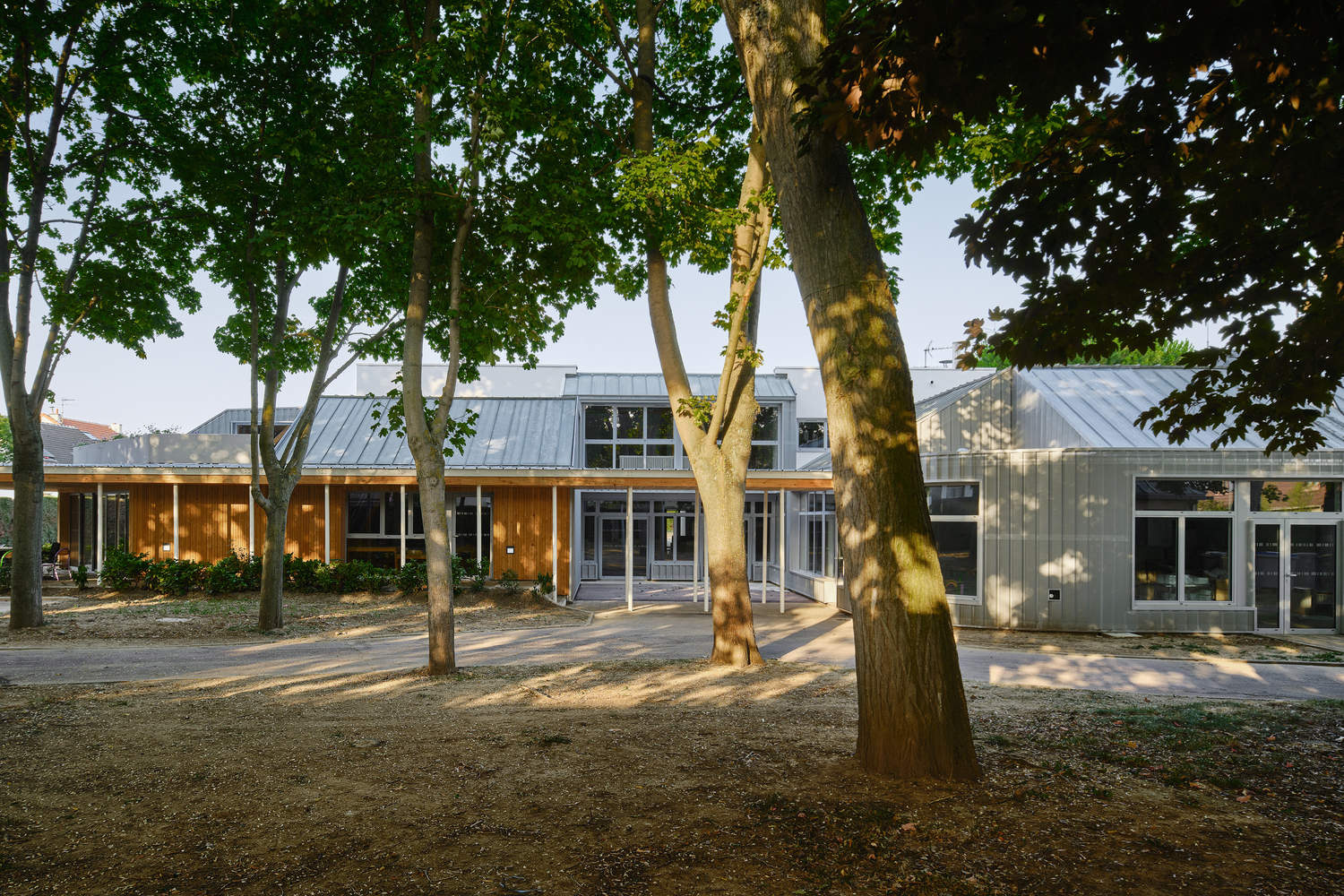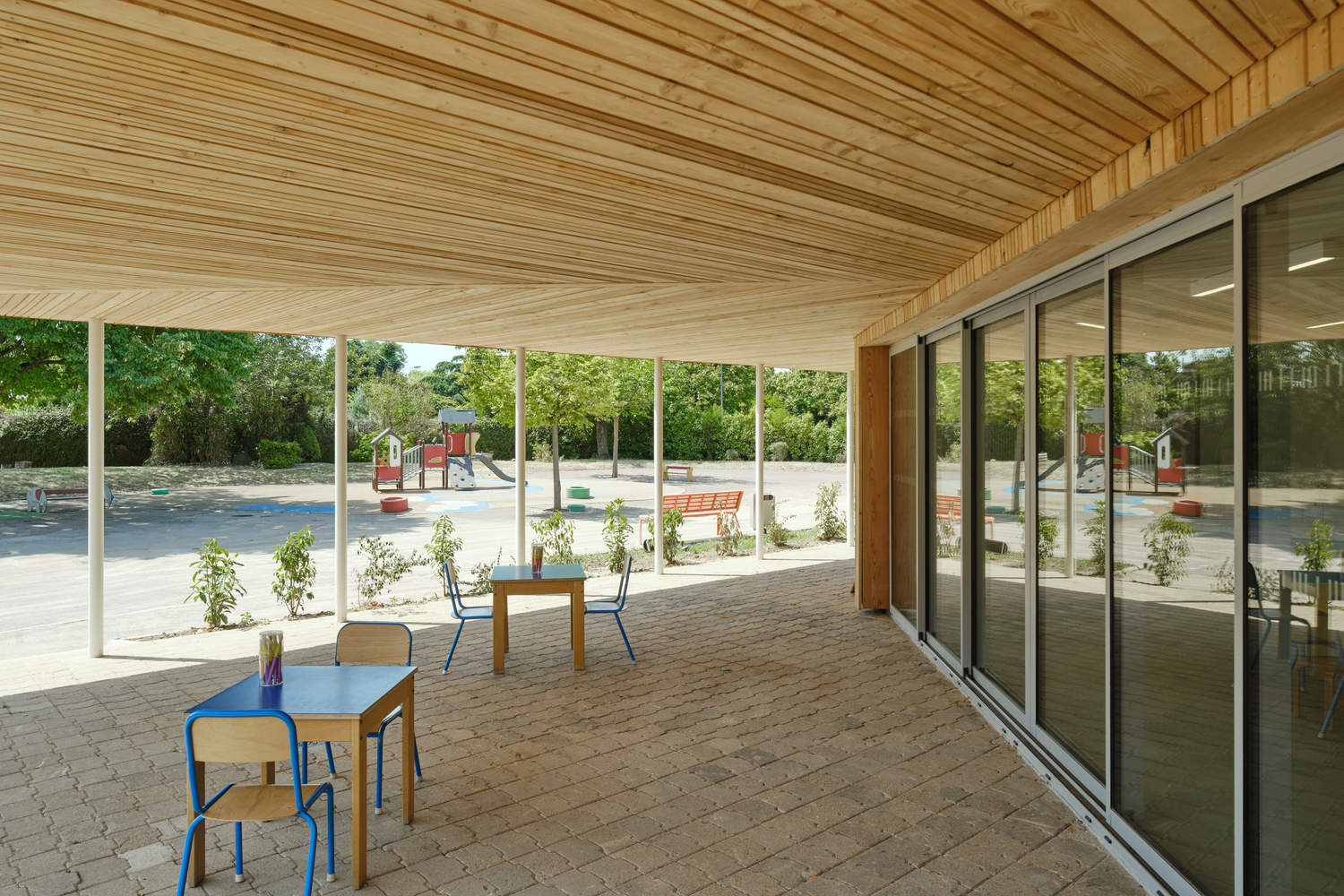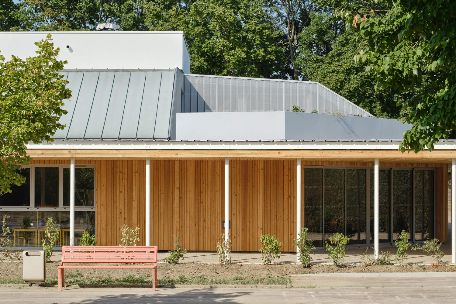 The gallery features a light and vibrant colonnade in white steel. Its facades and interior roof, protected from the sun and rain, are clad in European larch planks in a golden and warm shade. The interior refurbishment is based on retaining and refurbishing the existing structures: joinery, facilities... Work on the surrounding area aims to increase the amount of greenery to make it a pleasant and refreshing environment. Many materials were reused for this purpose: paving, existing plants for new planting, and making furniture and games from a tree that needed to be felled. The initial results after the building was commissioned in the summer of 2022 are very encouraging. Users have already confirmed improved thermal comfort in all seasons.