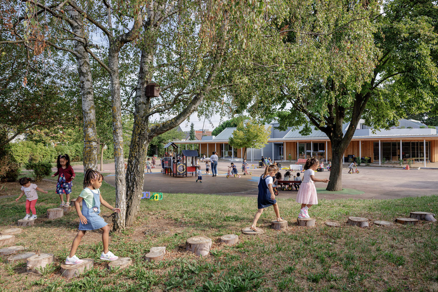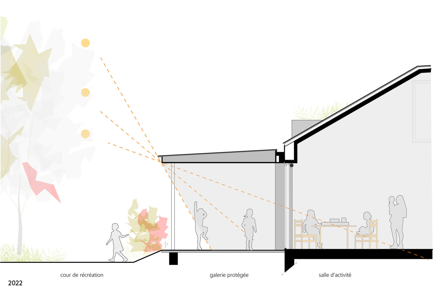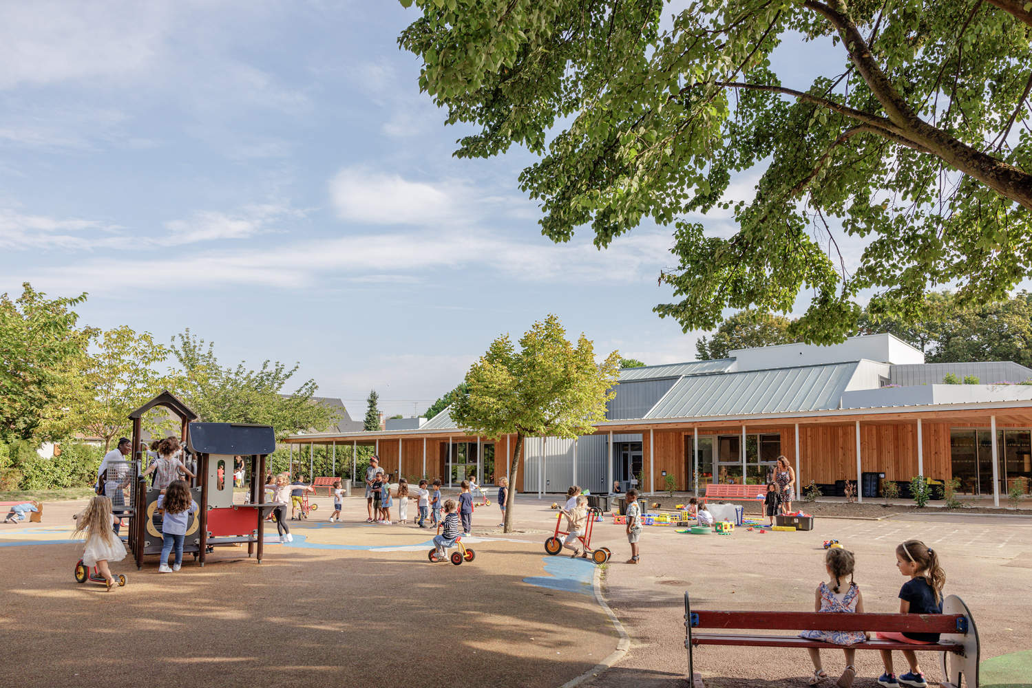The gallery features a light and vibrant colonnade in white steel. Its facades and interior roof, protected from the sun and rain, are clad in European larch planks in a golden and warm shade. The interior refurbishment is based on retaining and refurbishing the existing structures: joinery, facilities... Work on the surrounding area aims to increase the amount of greenery to make it a pleasant and refreshing environment. Many materials were reused for this purpose: paving, existing plants for new planting, and making furniture and games from a tree that needed to be felled. The initial results after the building was commissioned in the summer of 2022 are very encouraging. Users have already confirmed improved thermal comfort in all seasons.