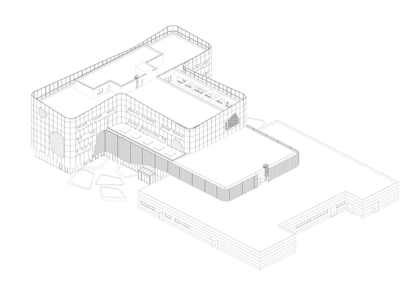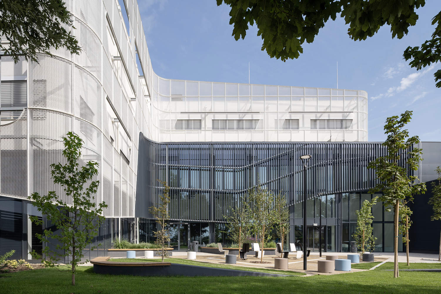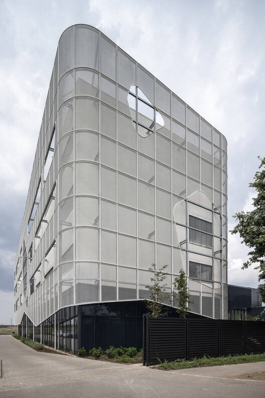 Concept - The unique aspect of the design lies in the intersection of two main functions with distinct characteristics within a single building: the public, open educational wing contrasts with the closed, box-like mass of the manufacturing unit. To resolve this contrast, inspiration was drawn from the research activities occurring in the laboratories: the dissolution, effervescence, and the visually dynamic process of chemical transformation. During a chemical reaction, the two distinct building masses interact. The white, foam-like upper structure dissolves the lower, angular mass, and this interaction creates larger openings, which appear to float on the white façade. The industrial part of the building draws from the surrounding anthracite-clad industrial halls in terms of architecture, while the university wing rests on top of it as a more sophisticated, detailed volume.