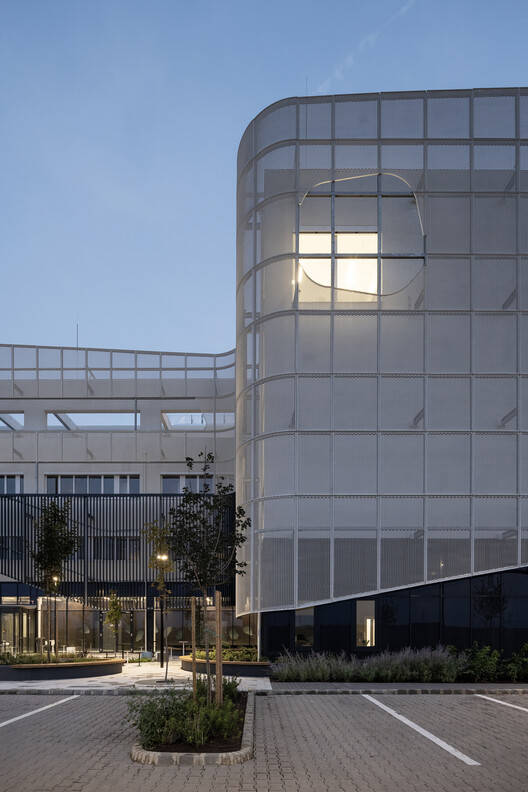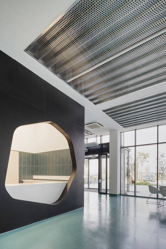 功能与形式的和谐统一:该项目最引人注目的亮点在于其功能性与形式美学的完美结合。建筑师巧妙地将公共开放的教育翼与封闭的制造单元这两个截然不同的功能体量融为一体,并通过设计语言的统一性来化解两者之间的冲突。这种设计理念并非简单的并置,而是模拟了实验室中化学反应的过程,上部的白色“泡沫状”结构与下部的棱角分明的建筑体量相互作用,形成视觉上的动态平衡,并在立面上创造出漂浮的开口,赋予建筑独特的视觉冲击力。这种设计手法不仅美观,也暗示了项目内部的学术氛围和创新精神。