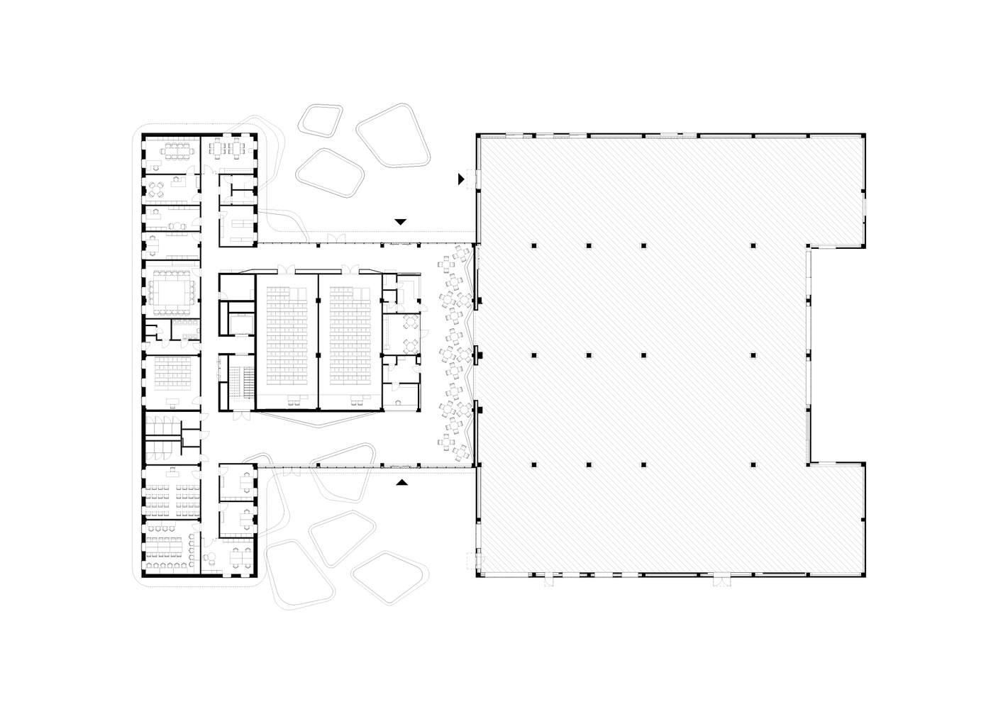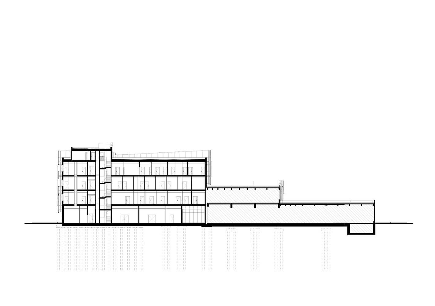 Text description provided by the architects. Function - The building's educational wing is a four-story structure with a central corridor and a "T" layout. On the ground floor, there are two lecture halls with a capacity of 100 people each, an atrium, and administrative offices. The upper levels house research and teaching laboratories, classrooms, a library, and a simulation plant. The building hosts the Dean's Office of the Faculty of Pharmacy and four departments: the Department of Pharmaceutical Technology, the Department of Biopharmacy, the Department of Pharmacology, and the Department of Medicinal Plants and Drug Studies.