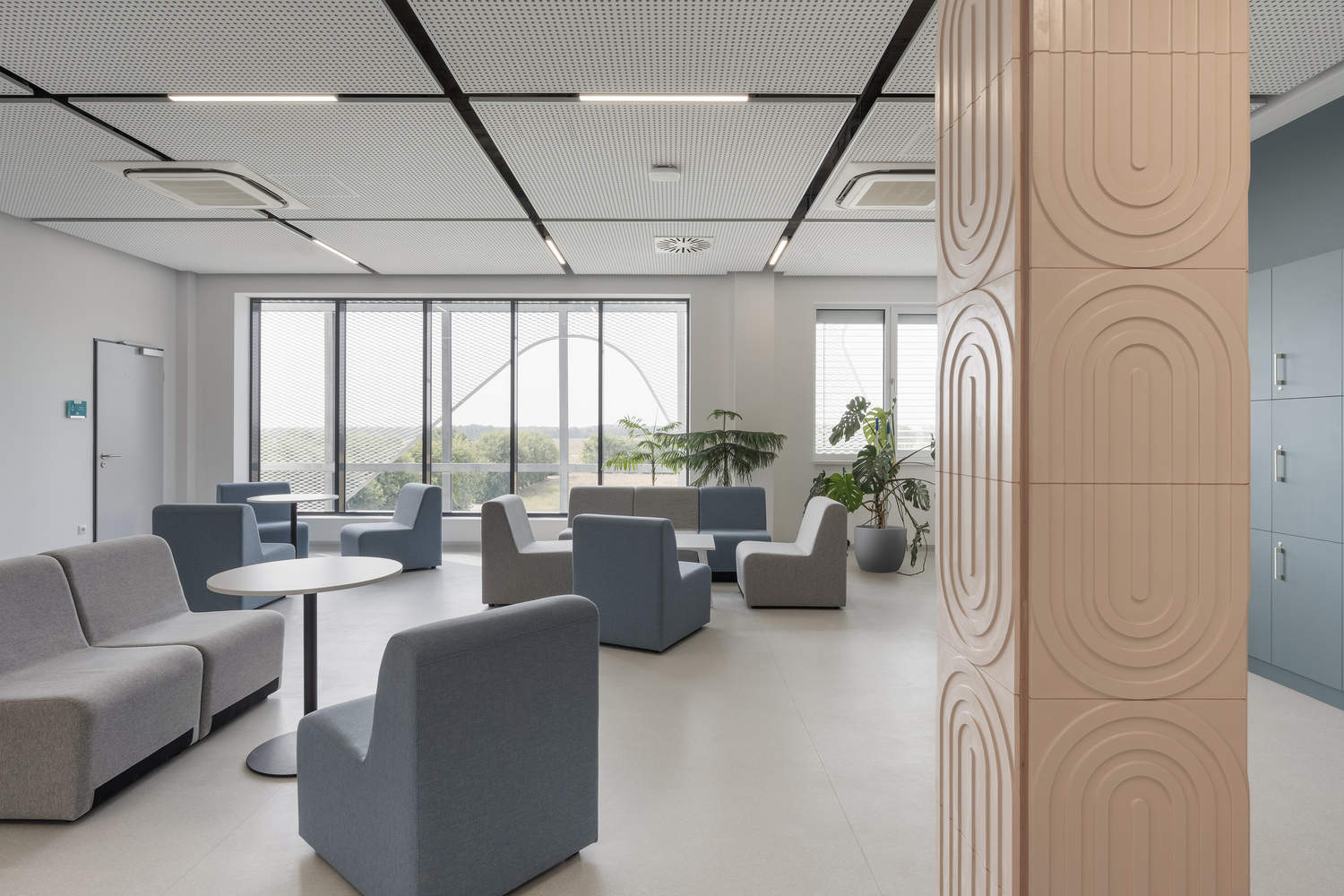 概念-设计的独特之处在于,在一栋建筑内,两个具有不同特征的主要功能相互交叉:公共、开放的教育翼与封闭的、箱形的制造单元形成鲜明对比。为了解决这种对比,我们从实验室的研究活动中获得了灵感:溶解、泡腾和化学转化的视觉动态过程。在化学反应过程中,两个不同的建筑体相互作用。白色的泡沫状上部结构溶解了下部的棱角状物质,这种相互作用产生了更大的开口,这些开口似乎漂浮在白色的立面上。建筑的工业部分在建筑方面借鉴了周围无烟煤覆盖的工业大厅,而大学翼则作为一个更复杂、更详细的体量坐落在其上。