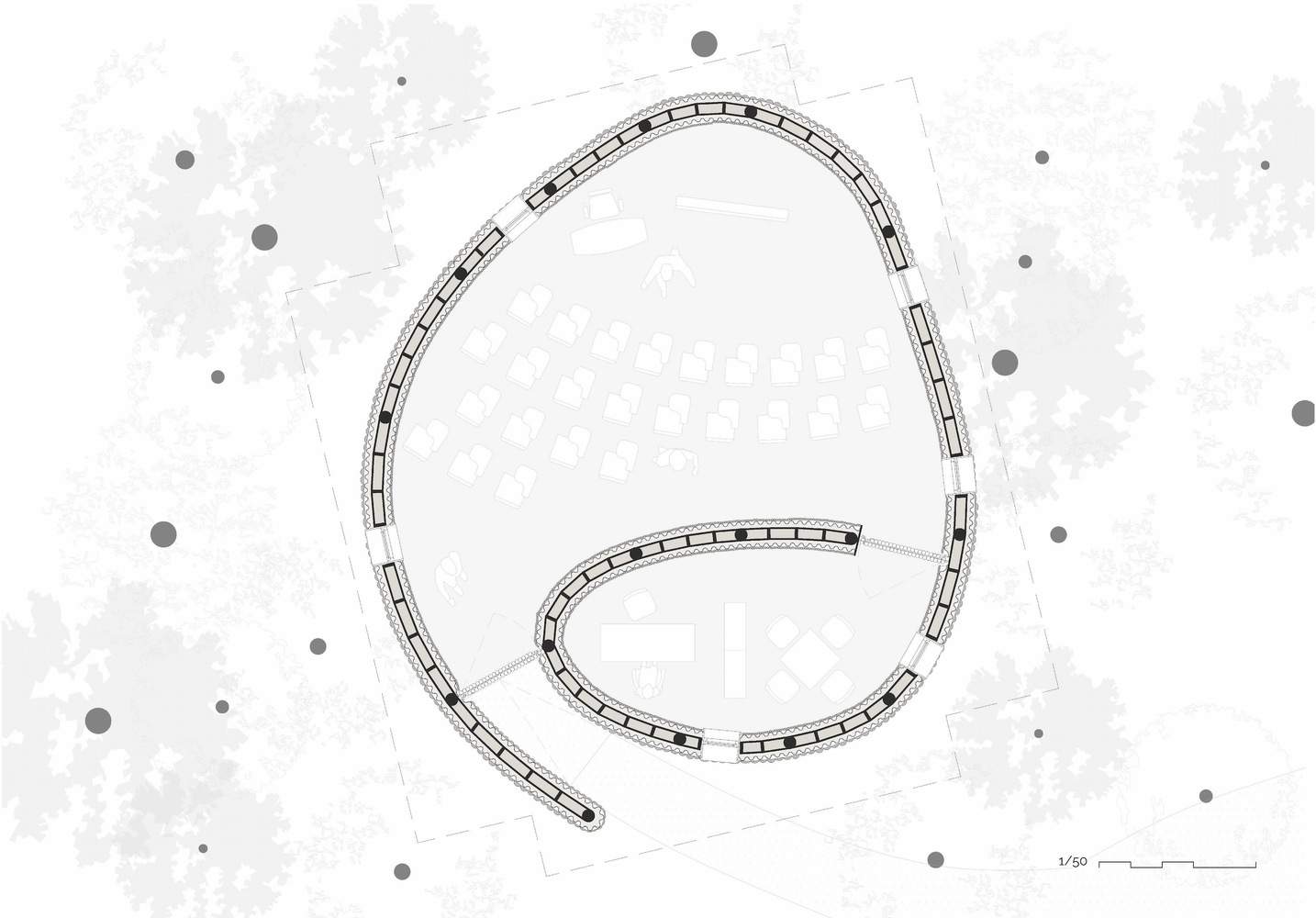 这个概念是为依偎在树林里的孩子们创建一个小村庄,保留现场的旧房子,以容纳额外的教室和服务。这片土地是一片富含当地树种的森林,目标是将学校和谐地融入自然环境。为了实现这一目标,教室被设计成一个分散的城镇,战略性地放置在森林中的空地上教室的形状柔软而有机,呈螺旋状,灵感来自肯尼亚的maasai manyatas和其他乡土建筑。