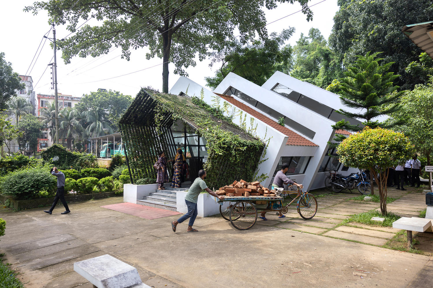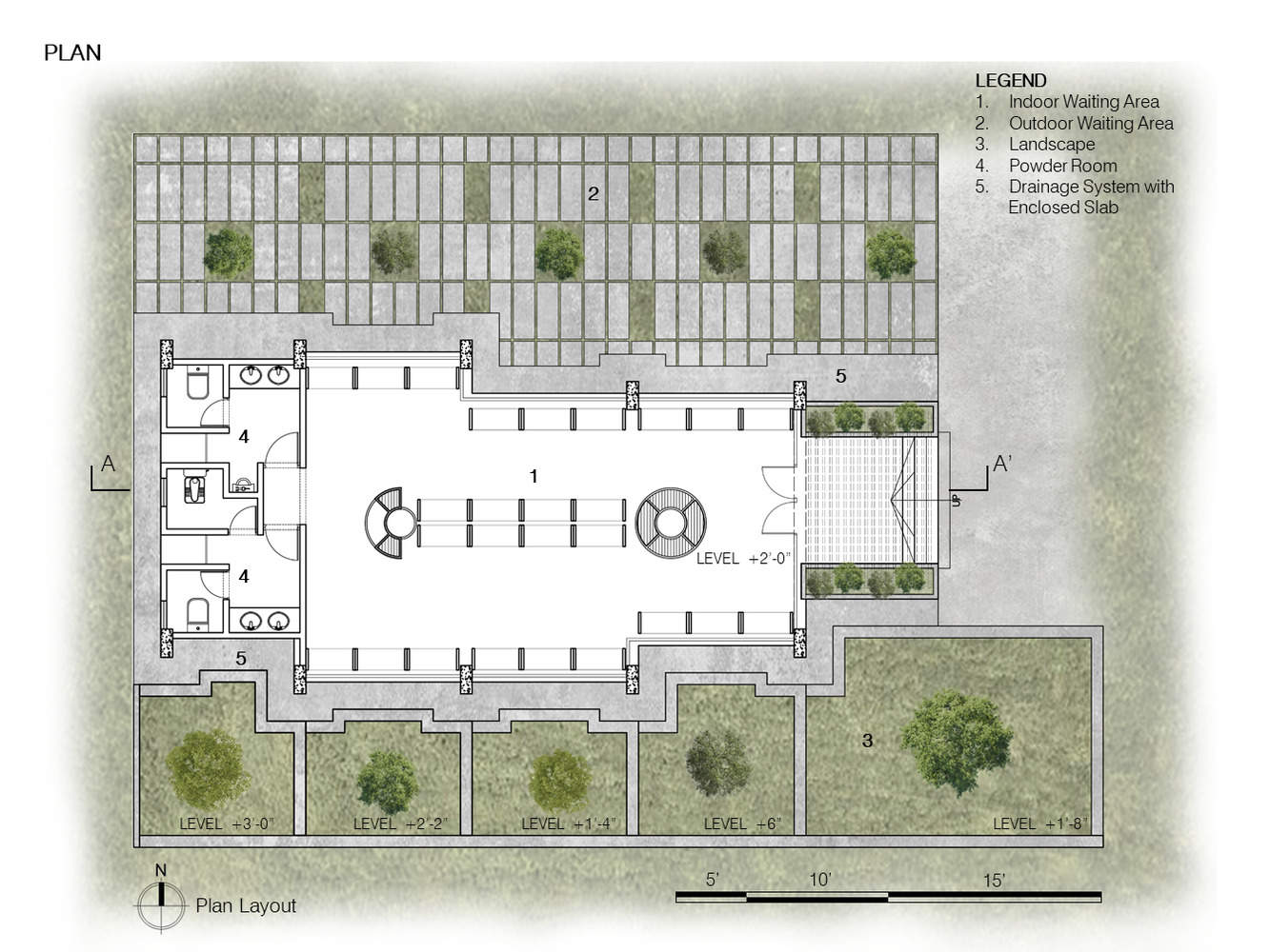 With the transparency of the space, the architects have successfully created connection and communication between the indoors and outdoors, nature and man-made structures, light and darkness, and shades and shadows, which adds a unique ambiance to the building. The greeneries, resting areas, and height variations of the landscape create a diversity of spaces to encourage users to enjoy nature and engage in discussions.