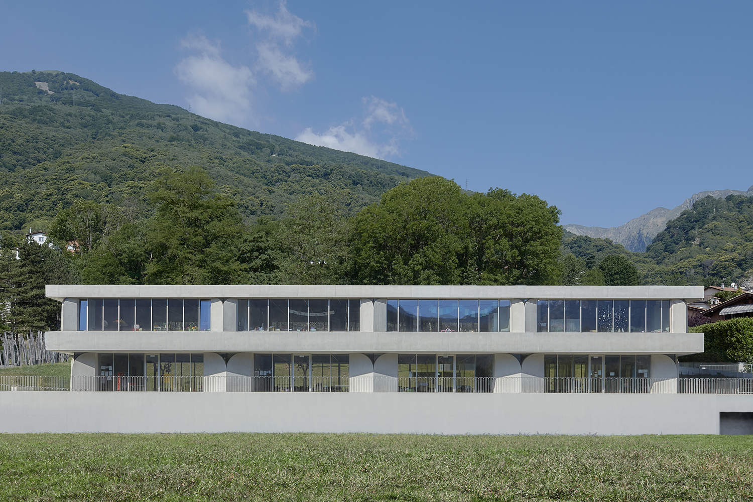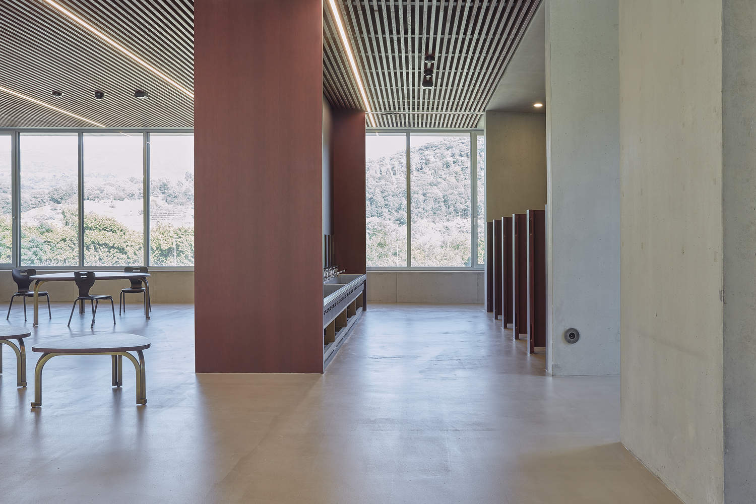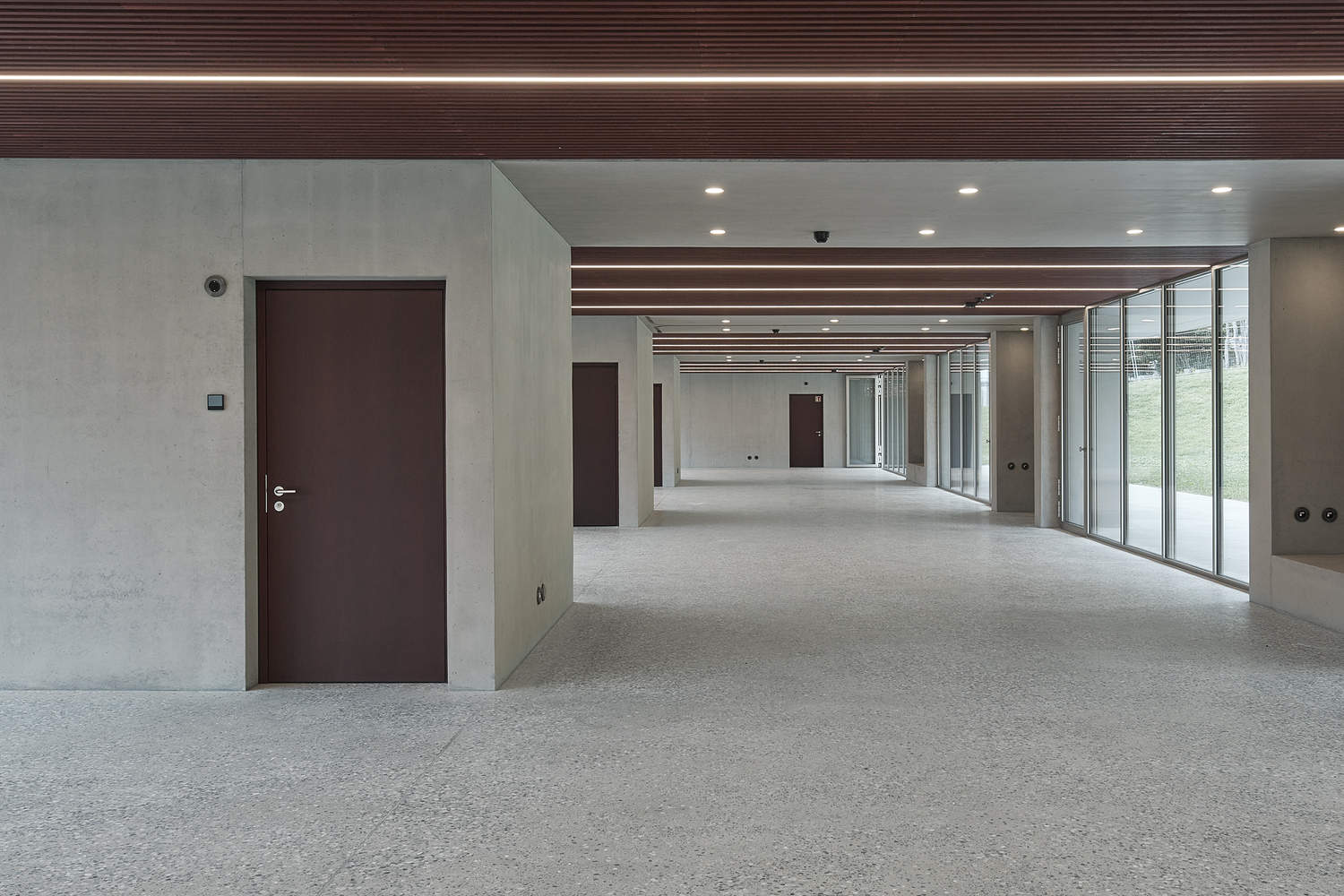 The east and west fronts of the School are glazed, expressing horizontal linearity and reinforcing the transparent transverse connection between the park area and the sports field area. The north and south fronts, on the other hand, are blind and define the head and end of the architectural body. On the outside, the area reserved for the enclosed garden of the Kindergarten is to be modelled. The natural terrain and spaces currently dedicated to the public park and grove will remain unchanged.