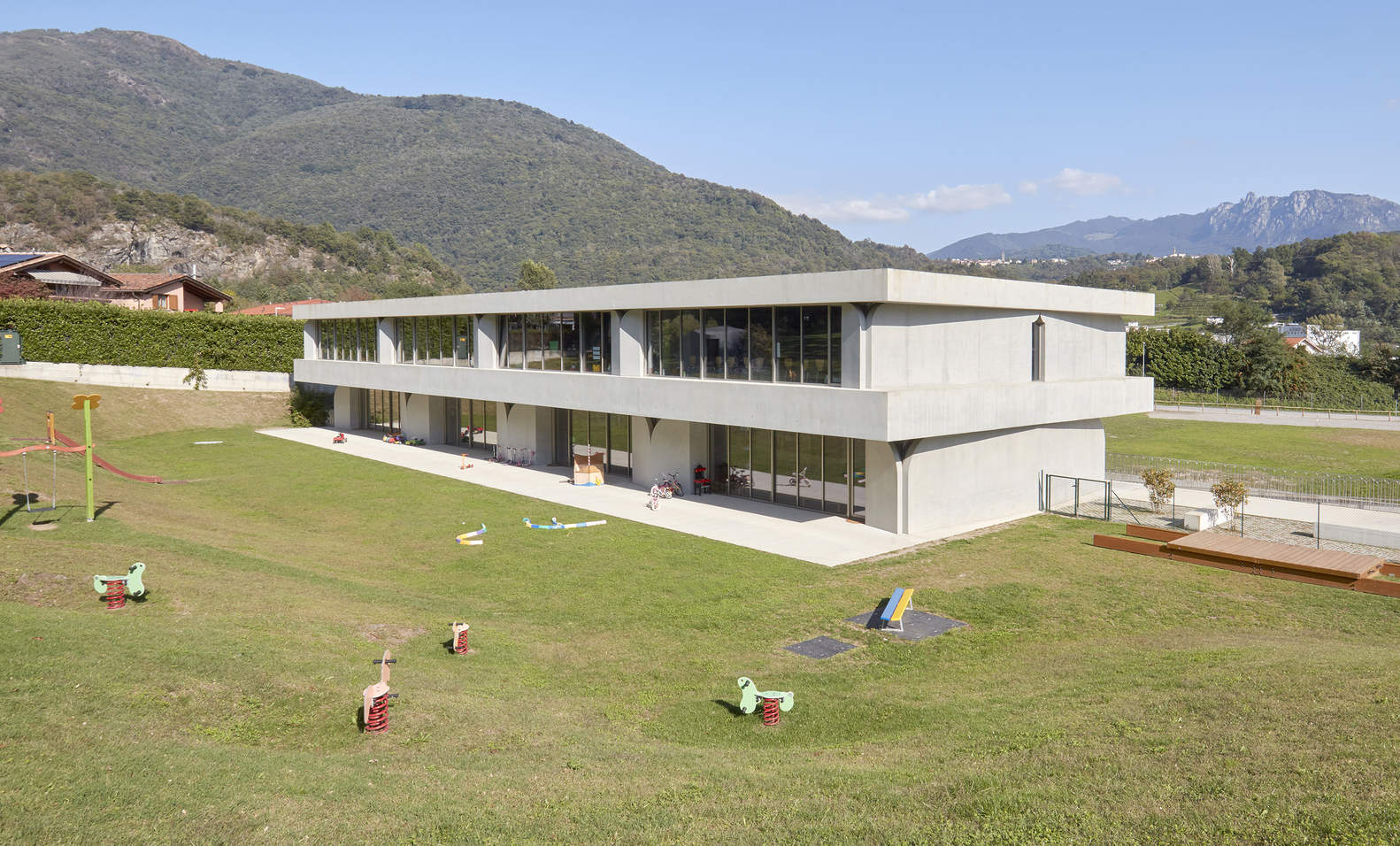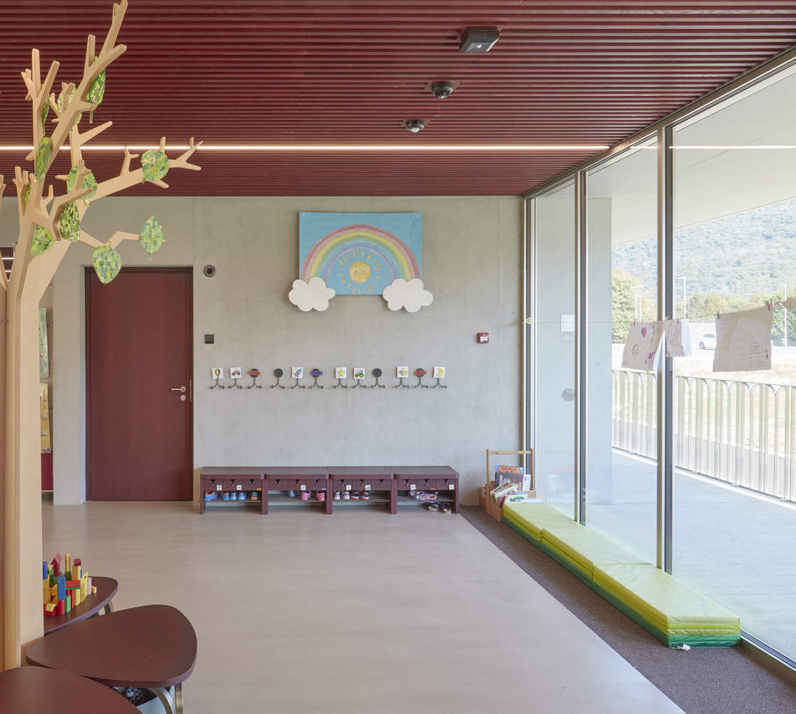 The reading of the project is conceived on several levels, from the territorial scale to the scale of the child. The four sections are characterized by a rhythm of solids and voids. The structure and the connecting vertical volumes define the four spaces of the Kindergarten sections. The four entrances welcome the children into the atrium. From this space, one can go upstairs or reach the movement space. This space can, if necessary, be divided by a movable wall. From the movement rooms, one can access the covered paved area outside and thus reach the green garden.
