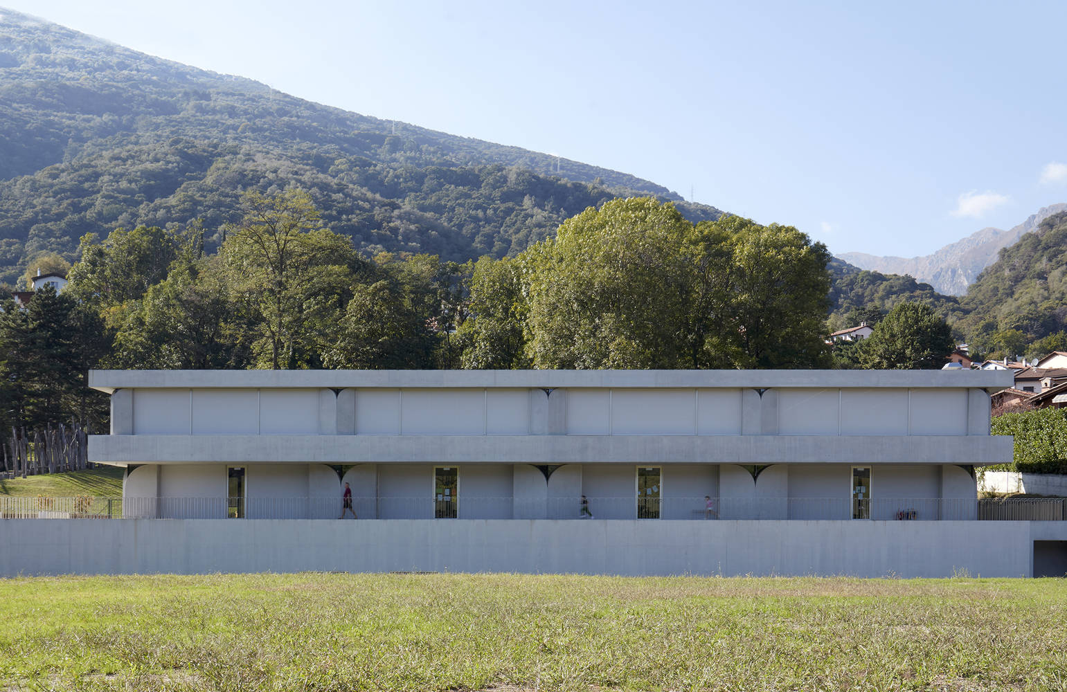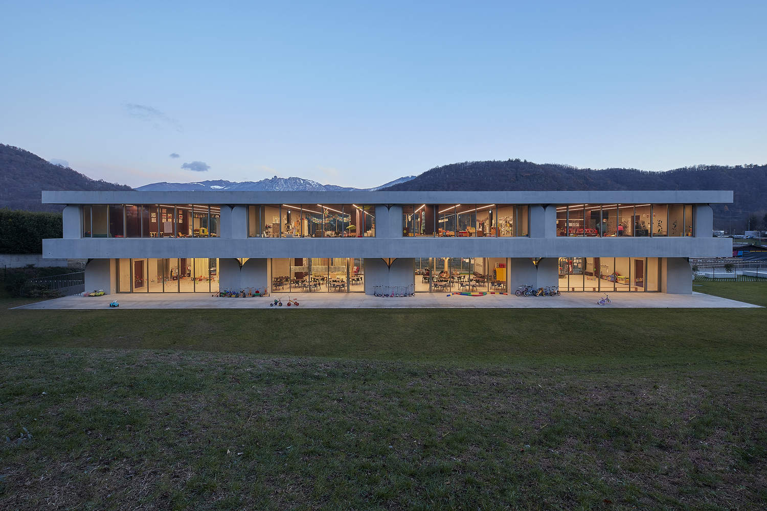 设计概念与场地融合:托里切拉幼儿园项目最引人注目的亮点在于其与现有场地环境的巧妙融合。设计团队没有将幼儿园孤立地置于场地之上,而是将其视为基础设施的一部分,与现有的民防避难所、规划中的运动场以及周围的公园绿地紧密相连。通过将建筑抬升至高架基座,并利用水平线条的视觉语言,设计实现了建筑与环境之间的和谐统一,充分尊重了原有地形地貌,并创造出一种开放、通透的视觉感受,使得幼儿园仿佛从环境中生长出来,而非突兀地插入其中。这种设计策略体现了对场地特性的深刻理解和对可持续发展的积极思考。