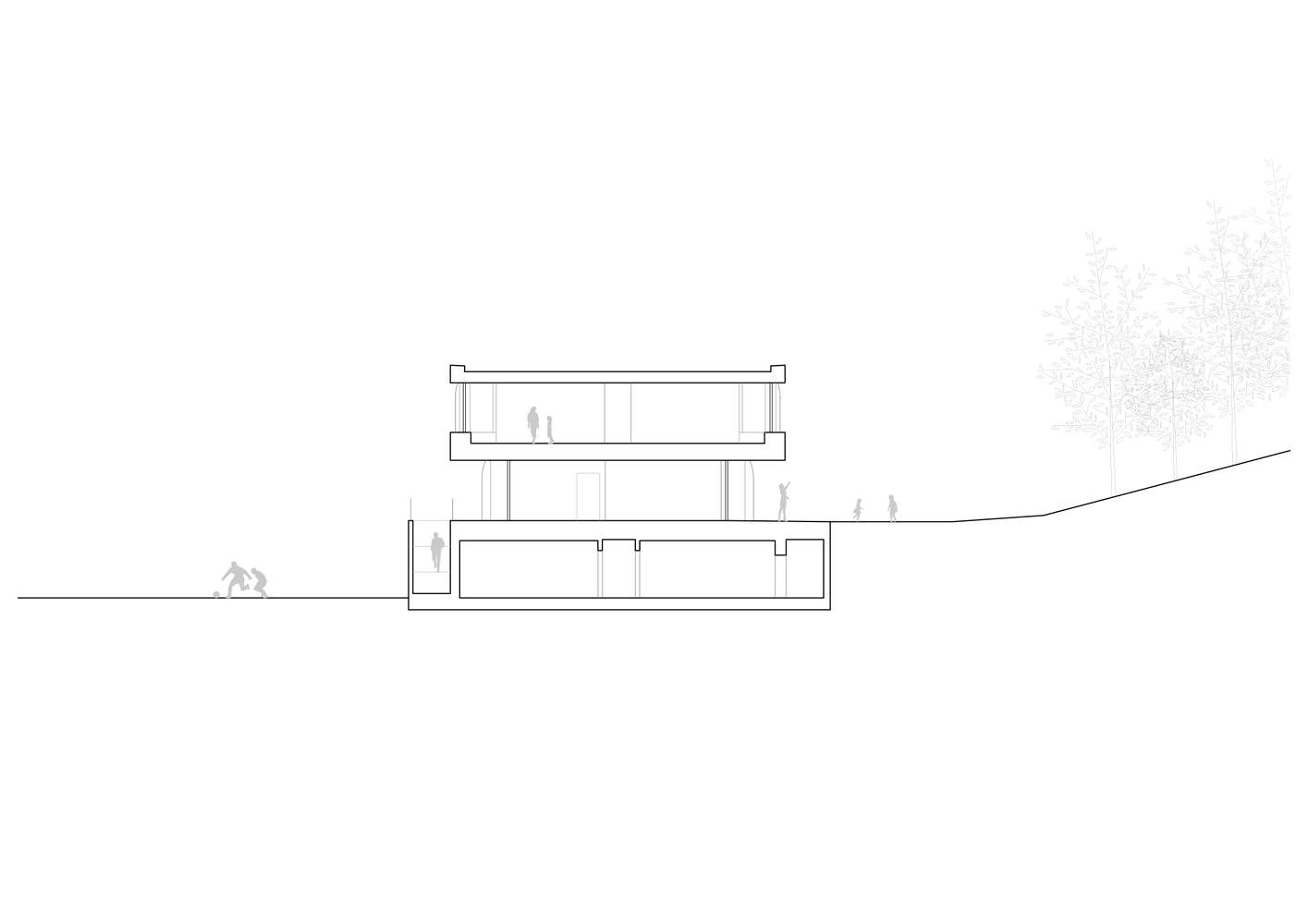 该墙成为该项目的解释对象,将人行道描述为地下室。幼儿园主要被视为一个基础设施元素,成为高架基座步行的组成部分并结束了这一步行。建筑坐落在讲台上,通过并置学校两层楼的两条新的水平线来表达同样的表情。这三个部分用相同的抽象语言画出了三条水平线。从地球到天空,三条线逐渐变细。干预的身份是由这个不可分割的三方创造的,他们的公共使命是登上领奖台。这座建筑体积紧凑,分为三层。根据规划项目提供的坡道将未来运动场的地板连接到为学校入口规划的人行道。