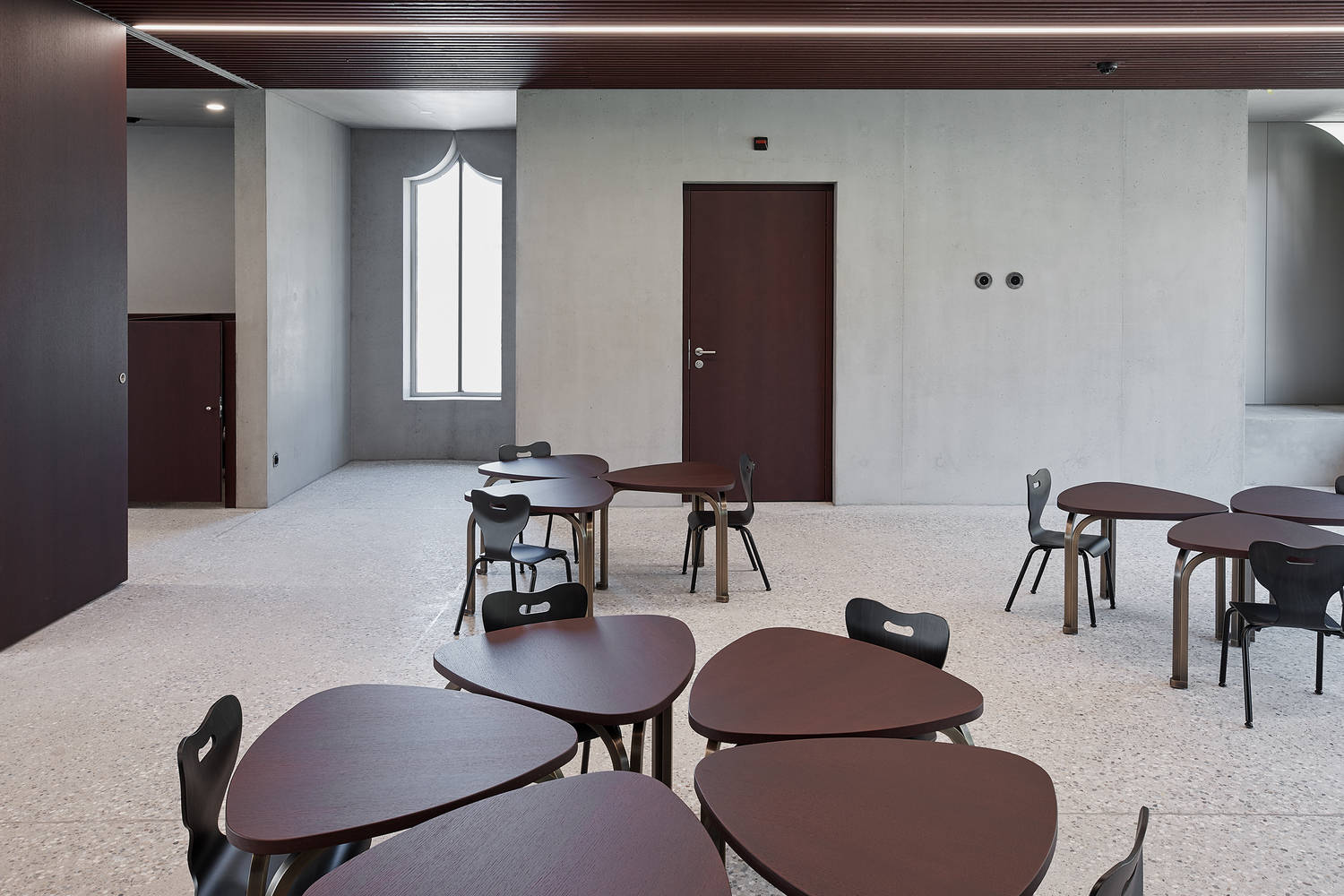 建筑师提供的文字描述在这个隔间里,各种公立学校和体育设施的建设是分阶段规划的,包括幼儿园的建设作为第一项工作。根据建筑参数,学校将位于现有的民防避难所上方。厨房、储藏室、技术室和服务入口等功能空间应位于庇护所的高度,以便在高空与庇护所相连。